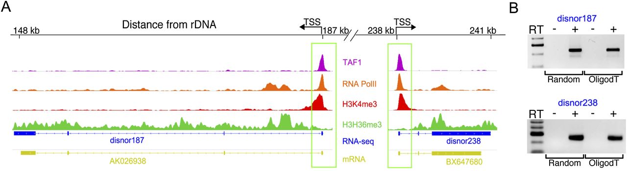 DJ transcript profiling. (A) ChIP-seq reveals chromatin features consistent with transcription originating from promoters at 187 kb and 238 kb (boxed) in the DJ. Top four tracks are an enlargement of selected chromatin features from Figure 6A. Bottom two tracks show RNA-seq and cDNA mapping results. Exons are indicated by blocks. These identify spliced transcripts (disnor187 and disnor238) similar to cDNA clones AK026938 and BX647690. (B) RT-PCR using primers to detect disnor187 and disnor238 transcripts in HT1080 cells. Random and oligo(dT)-primed RT-PCR products of the expected sizes for spliced transcripts were produced.