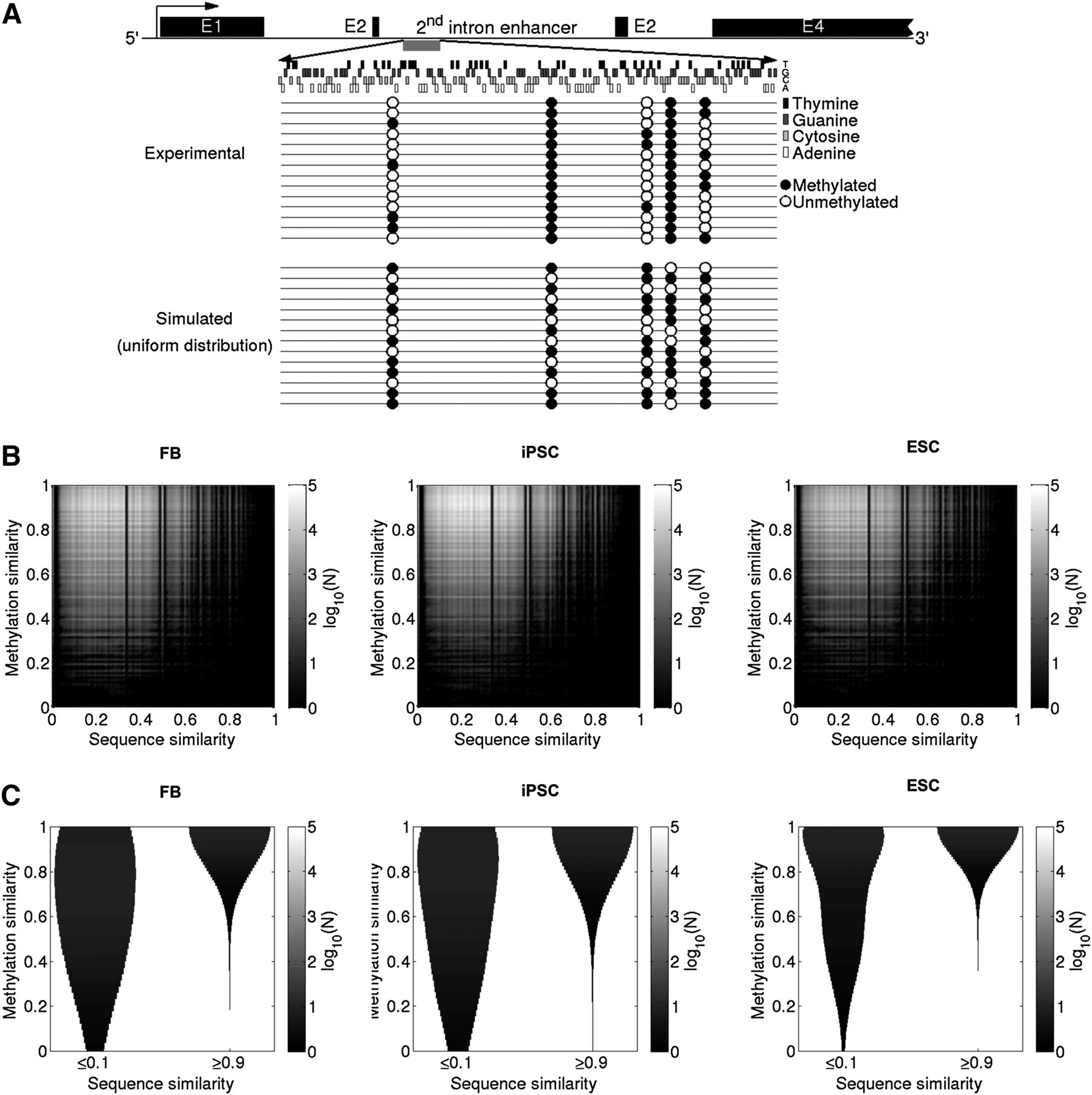 DNA methylation patterns are nonuniformly distributed and are influenced by their DNA context. (A) Analysis of the methylation state of nestin (NES) second intron enhancer region. The lollipop diagram in the top panel shows the observed 58.6% global methylation (Han et al. 2009). Such methylation is nonuniformly distributed along CpG “columns.” There are CpG “columns” with higher and lower probability to be methylated. In simulations with a uniform distribution of the methylation states, we can observe lollipop diagrams such as the one shown in the bottom panel, with the same methylation percentage as the one experimentally observed, but with nonpreferential “column” methylation distributions. (B) Heatmaps of the frequencies of the similarity of the methylation between the two DNA strands versus the similarity of the sequence of the two DNA strands for each CpG word. (C) Violin plots of the frequencies of the methylation similarity between the two DNA strands for low (≤0.1) and high (≥0.9) sequence similarity between the two DNA strands. The similarities are calculated genome wide, and their frequencies are represented in log10 scale by gray color bars.