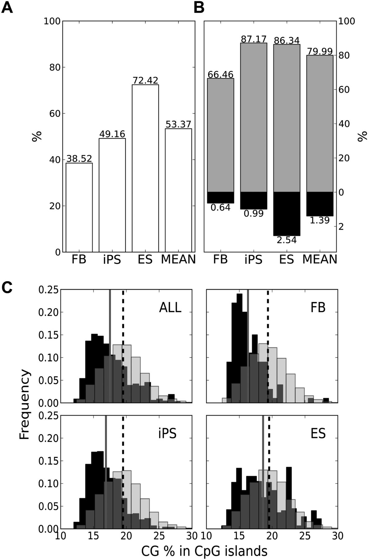 Correlation of methylation-resistant and methylation-prone CpGMM targets with CpG islands for each cell type. Percentage of CpGMM targets of each cell type that lie inside CpG islands (A) and methylation-resistant and methylation-prone CpGMM targets of each cell type that lie inside CpG islands (B). The methylation-resistant percentages are in gray, the methylation-prone in black, and the merged ones in white. The rightmost bars correspond to the mean across all the populations. (C) Histograms of the CG content of the CpGMM targets inside CpG islands for the pool of all samples (ALL), fibroblast (FB), iPS, and ES. The dashed and gray vertical lines mark the positions of the mean of the methylation-resistant and methylation-prone distributions, respectively.