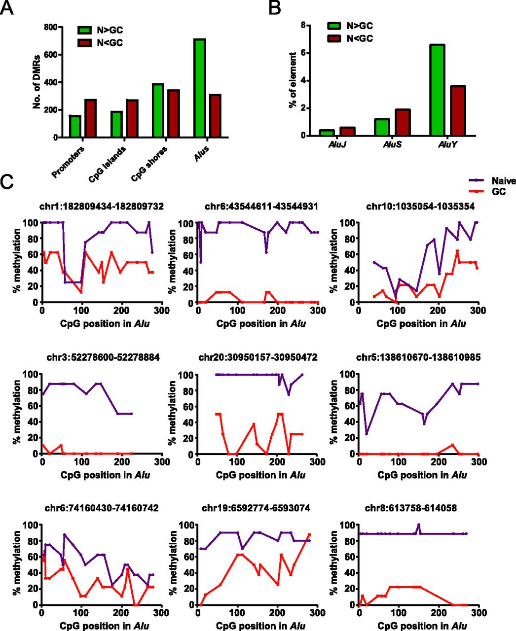 Widespread loss of DNA methylation at Alu elements in GC B cells. (A) Distribution of DMRs between naive and GC B cells at various genomic features (for definition of each genomic feature, see Methods). The bar graph illustrates the number of loss-of-methylation DMRs (naive > GC) in green and gain-of-methylation DMRs (naive < GC) in red that overlap with the indicated genomic feature. (B) Percentage of elements within each Alu subfamily (J, S, and Y) with loss (N > GC) or gain (N < GC) of methylation in GC compared to naive B cells by MIRA-seq analysis. (C) Validation of differentially methylated Alu elements in naive and GC B-cell populations by genomic bisulfite sequencing. The methylation status of CpGs across nine Alu elements was analyzed. After bisulfite treatment and PCR amplification of the Alus, at least eight individual clones of the PCR product were analyzed. The percentage of methylated cytosine (y-axis) was calculated at individual CpG positions relative to the 5′ end of each Alu element (x-axis). The genomic location (hg19) of the Alu elements analyzed are listed above each graph.