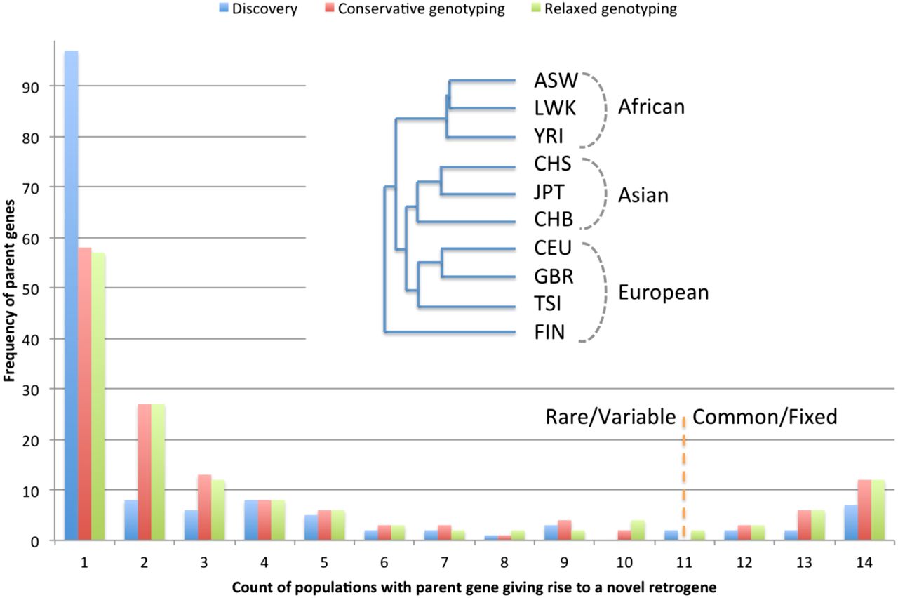 Frequency of novel retroduplications by populations. Most of the novel retroduplications are discovered in only one population (due to conservative calling) but are present in a few more as evident from genotyping. The phylogenetic tree was constructed based on the overlap of novel retroduplications between different populations. The tree shows that, except in one case, populations separate perfectly by continental groups. Outlier clustering of the Finnish population (FIN) is likely due to its distinct data properties allowing discovery of more unique retroduplications (see text). Admixed populations and the Iberian population (with just a few sequenced individuals) were excluded from phylogenetic analysis.