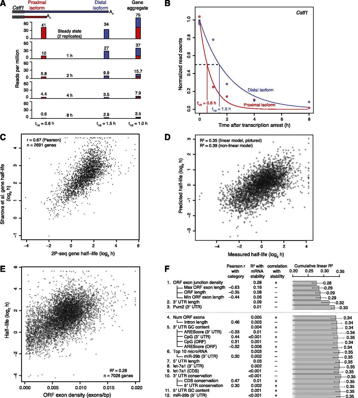 mRNA and isoform half-life values, and modeling of associated mRNA features. (A) Schematic of approach used to measure half-lives of tandem 3′ UTR isoforms. Distal and proximal isoforms are illustrated for cleavage stimulation factor subunit 1 (Cstf1). For each time point after transcriptional arrest with actinomycin D, 2P tags are plotted for each isoform as well as a gene-level aggregate, showing the corresponding half-life estimates below. Tags for the 0 h (steady-state) replicates were averaged. (B) Fitted exponential degradation curves, shown for the same isoforms as in A. An additional normalization factor not considered here was used to correct for the slight decrease in total mRNA at later time points, resulting in slightly lower final half-lives of 0.52 h (proximal) and 1.20 h (distal). (C) Correlation between gene-based half-lives determined in 3T3 cells (2P-seq) with previous results in mouse embryonic stem cells (Sharova et al. 2009). (D) Correspondence between our measured half-lives and mRNA half-lives predicted using a model trained on a separate 50% of our data. For each gene with multiple tandem 3′ UTRs, only the most proximal isoform was used to quantitate gene half-life, although results were similar when averaging over all isoforms or using only the most distal isoform. (E) The correspondence between mRNA half-life and ORF exon-junction density. A maximum of 0.02 exons/bp was used for ORF exon-junction density, affecting seven of the 7028 genes. (F) Sequence features used to predict half-lives, arranged in approximate order of importance in the model. Adding more features resulted in diminishing returns, with a model including only the top three to six features performing nearly as well as any of the models with more features. Because of significant multicollinearity, features correlating well were grouped together (e.g., ORF length and ORF exon-junction density) with their pairwise correlation indicated (Pearson r). Also reported are each individual R2 with mRNA stability, and each cumulative R2 calculated for a linear model including all previous features. Predicted targeting for the top 10 miRNAs or for individual miRNAs was quantified using context scores (Grimson et al. 2007; Garcia et al. 2011). Error bars show 95% confidence intervals.