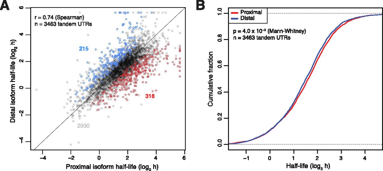 Isoform-specific quantification of mRNA stability. (A) Relationship between half-lives of the adjacent proximal and distal tandem 3′ UTR isoforms' half-lives, highlighting the statistically significant differences (P < 0.05, colored points) and their tallies (colored numbers). (B) Cumulative distribution function of data shown in A. Plotted is the fraction of genes with half-life exceeding the value of the x-axis. The very slight shift toward more stable proximal tandem UTR isoforms is statistically significant (P = 4.0 × 10−3, Mann-Whitney test, n = 3463 tandem isoform pairs).