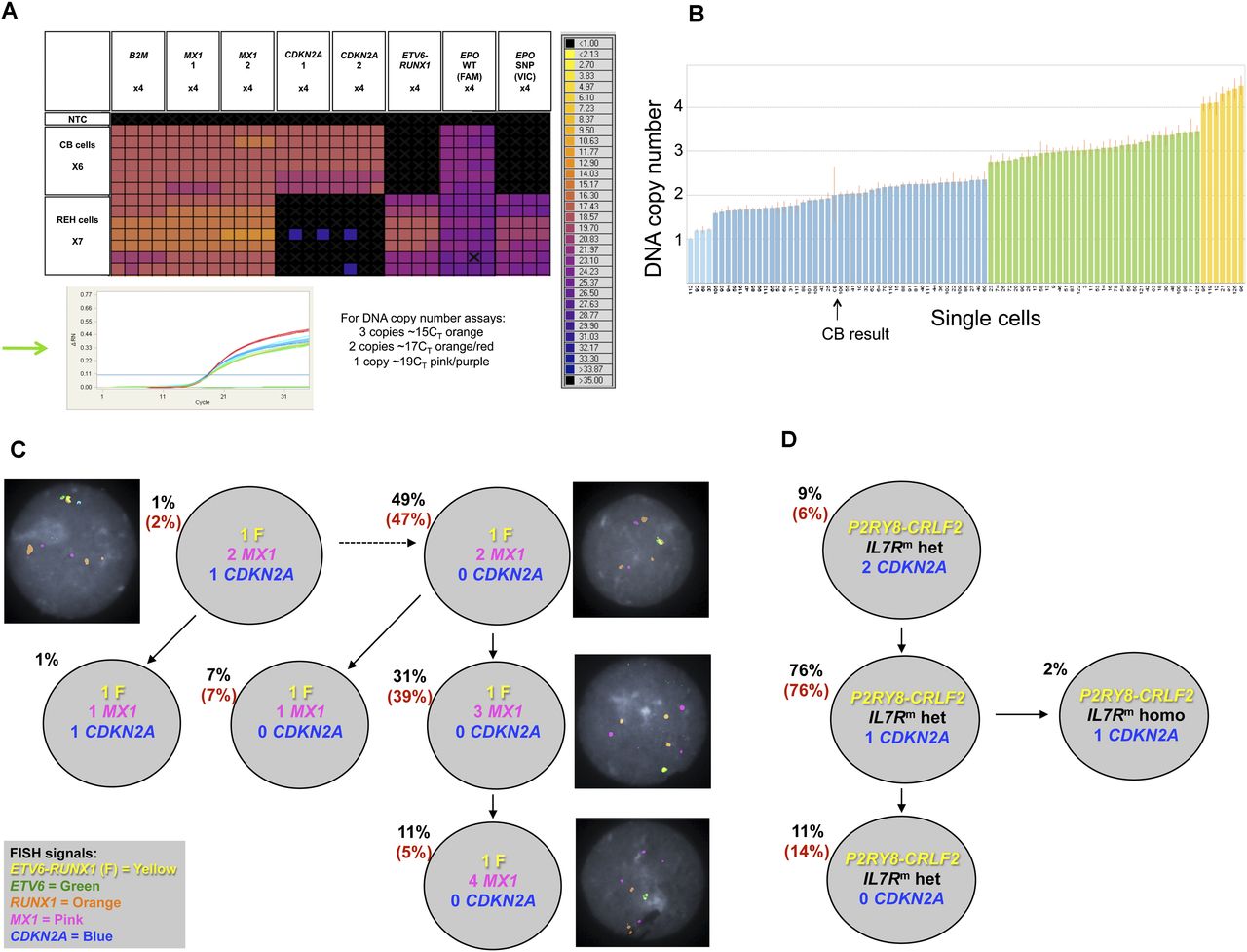 Single-cell genetic analysis of leukemic cells using the multiplex targeted Q-PCR approach and the BioMark HD platform. (A) Heatmap depicting an example of raw Q-PCR data from the BioMark HD. The rows represent single cells including six cord blood cells and seven REH cells. The columns represent assays, each completed in quadruplicate including B2M (one of three assays), MX1 (two of three assays), CDKN2A (two of three assays), the ETV6-RUNX1 fusion gene assay, and the EPOR SNP (rs318720) assay containing two Taqman probes, one complementary to the wild-type sequence (labeled with FAM) and the other complementary to the SNP sequence (labeled with VIC). The colored boxes at the junction of a row and column indicate the raw CT value (according to the key on the right) obtained for a Q-PCR reaction involving the indicated cell and assay. Assays targeting a mutation or the fusion gene provide a definitive positive or negative result indicating the presence or absence, respectively, of an alteration. The DNA copy number assays provide a raw CT value that requires further analysis (standard ΔΔCT method, Applied Biosystems) to attribute a DNA copy number to the target gene of interest for a single cell; an example can be found in B (refer to the Single-Cell Analysis section in the Methods, and Supplemental Material). (Green arrow) The Q-PCR amplification curves generated from each copy number assay for a single cord blood cell. (Black cross in a colored box) An inadequate amplification curve. (B) Graph depicting the estimated DNA copy number of MX1 attributed reliably to 89 single cells given the assay results from B2M (assay 3) and MX1 (assay 3); one of the nine estimated copy number results used to confidently attribute a DNA copy number to the gene of interest for a single cell. The height of the bar indicates the estimated DNA copy number, and the color of the bar indicates the integer; (light blue) one copy; (dark blue) two copies; (green) three copies; and (yellow) four copies. (CB) Cord blood. (C) Subclonal genetic architecture of the REH cell line inferred by multiplex targeted Q-PCR and confirmed by FISH analysis (126 and 100 cells, respectively); the percentages in parentheses are those obtained by FISH analysis. All cells harbored the ETV6-RUNX1 fusion (F) and the EPOR SNP compared with cord blood cells. DNA copy number is indicated for each gene and subclonal population. Representative FISH images are shown next to their respective subclone. (D) Subclonal genetic architecture of leukemic cells from a child with Down’s syndrome and acute lymphoblastic leukemia (DS-ALL) generated by multiplex targeted Q-PCR and FISH analysis (115 and 100 cells, respectively); 98% of cells harbored the P2RY8-CRLF2 fusion and the IL7R mutation (IL7Rm) by multiplex targeted Q-PCR. Of these, the majority were heterozygous mutations (IL7Rm hete). A minor subclone (2%) had a homozygous IL7R mutation (IL7Rm homo). Loss of CDKN2A was subclonal to the IL7R mutation and proceeded to homozygous loss in 11% of cells. FISH for the P2RY8-CRLF2 fusion and CDKN2A copy number confirmed these results (percentages in parentheses); the IL7R mutation cannot be detected by FISH.