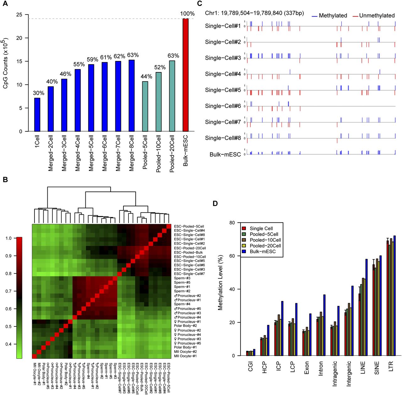 The sensitivity and reproducibility of the single-cell RRBS technique. (A) The number and proportion of CpG sites detected in the merged single mESC RRBS data set overlapped with those from the RRBS of the bulk mESCs. (B) Pearson correlation heatmap among the methylomes of all RRBS samples of single cells, pooled cells, or bulk cells. The color key from green to red indicates low to high correlation, respectively. (C) DNA methylation map of the CpG sites at a representative locus in the RRBS data from eight single cells and bulk mESCs. The upward blue bars and downward red bars indicate methylated CpGs and unmethylated CpGs, respectively. (D) The methylation levels of different genomic regions of single mESCs; pooled mESCs of five cells, 10 cells, and 20 cells; and bulk mESCs.