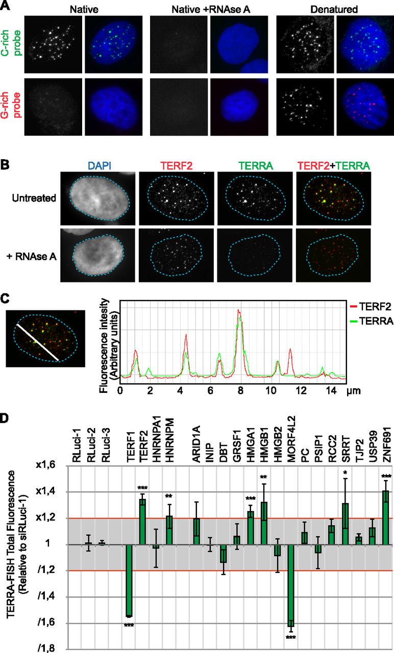 Quantitative TERRA-FISH after knockdown of the candidates in HeLa 1.3. (A) RNA-FISH with CCCTAA (green, upper panel) or TTAGGG (red, lower panel) LNA probes, including RNase A and denatured controls. (B) TERRA-FISH (green) coupled with TERF2 immunofluorescence (red). (C) Representative example of 10 independent experiments of signal intensity correlation between TERF2 (red) and TERRA (green) following the indicated white line. (D) Quantification of TERRA foci in HeLa 1.3 after knockdown of the candidate genes, relative to RLuc-1. Error bars indicate SD between three independent experiments. (*) P < 0.05, (**) P < 0.01, (***) P < 0.001.