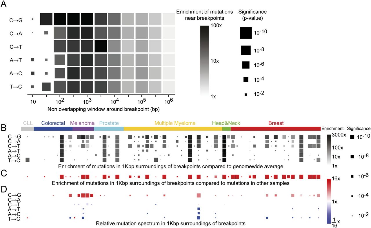 near breakpoints of that sample. (D) Mutation spectrum near breakpoints compared with spectrum across the genome of that sample. Hypermutated samples are often
