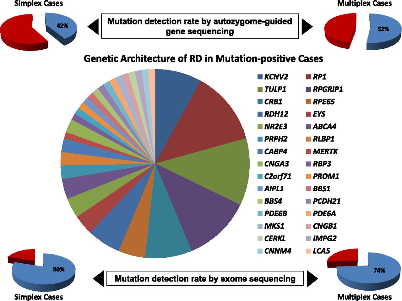 Central pie chart summarizes the contribution of various genes to the overall mutational pool among RD patients in the current study. Pie charts in the upper panel show the percentage of mutation-positive cases among simplex and multiplex cases using the autozygome-guided gene sequencing approach. Pie charts in the lower panel show the percentage of mutation-positive cases among simplex and multiplex cases using the exome sequencing approach. Please note the percentages in these charts do not take into account the novel candidate genes identified in this study.