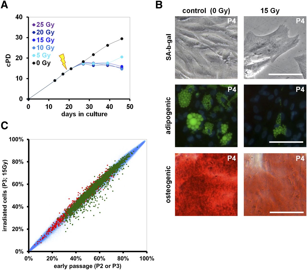 Irradiation-induced senescence does not result in SA-DNAm changes. (A) Representative growth curves of MSC after irradiation with different doses at passage 2 (0–25 Gy; black arrow). (B) Upon irradiation with 15 Gy, MSC acquire the typical senescent morphology with proliferation arrest and moderate SA-β-gal staining. Furthermore, adipogenic (green: BODIPY; blue: DAPI) and osteogenic differentiation potential (red: Alizarin Red; size bars 100 μm) is impaired after irradiation with 15 Gy. (C) Scatterplot analysis of DNAm of nonirradiated versus irradiated MSC. Long-term culture-associated hypermethylated (red) and hypomethylated CpG sites (green) are depicted. Irradiation did not result in any significant DNAm changes.