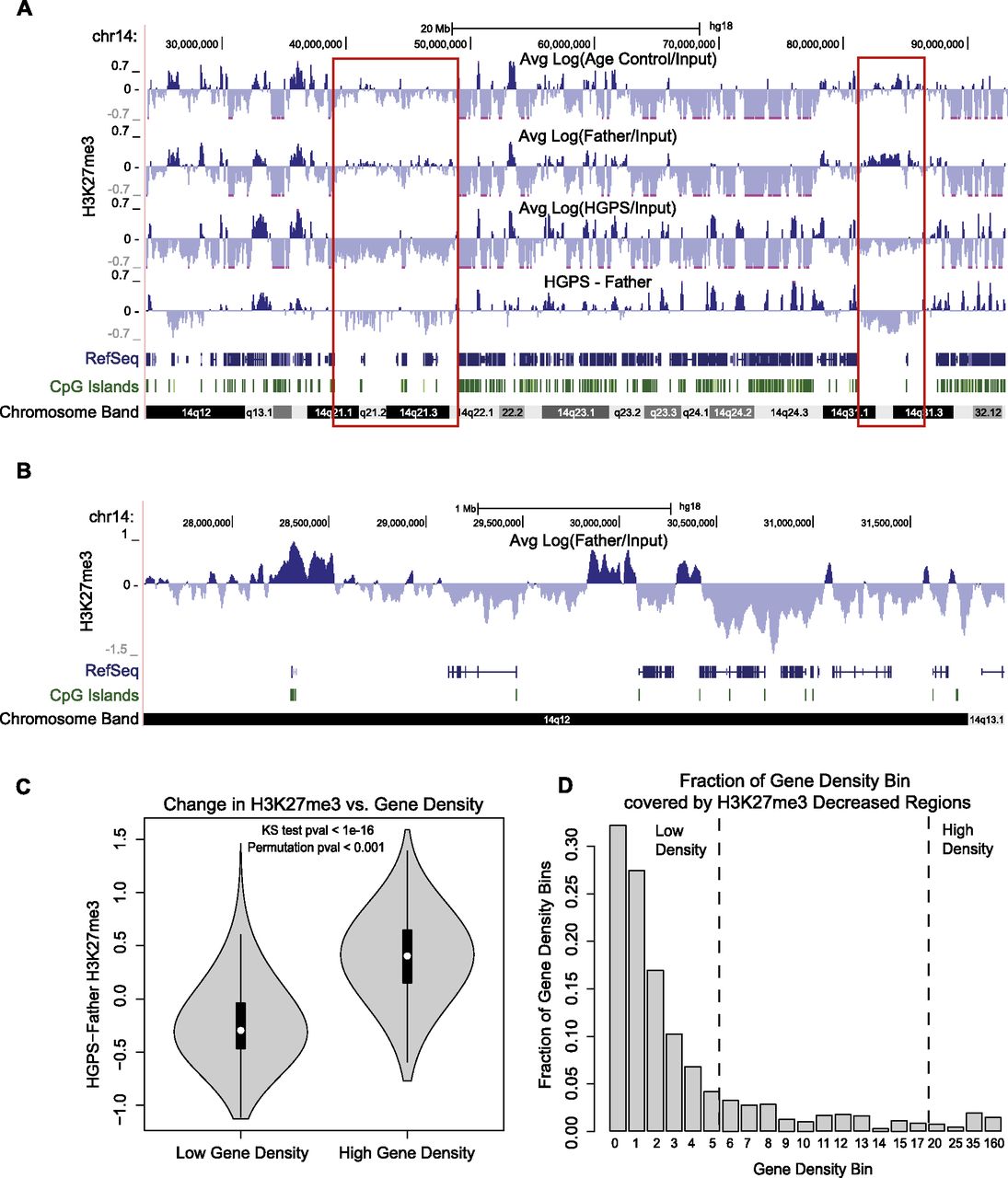 The correlation between gene density and changes of H3K27me3 signals in HGPS. Three primary fibroblast cell lines used in all experiments were HGADFN167 (HGPS), HGFDFN168 (Father, normal), and AG08470 (Age Control, normal). (A) H3K27me3 signals for Age Control, Father, HGPS, and the difference between Father and HGPS (HGPS-Father) are shown at 25-kb resolution across a region of chromosome 14. Patches of H3K27me3 enrichment are observed in gene-poor regions in control samples (red boxes), and these regions show decreased H3K27me3 in HGPS. RefSeq genes are shown below to indicate gene density, and the locations of CpG islands are noted. (B) A 4-Mb region of chr14 shows enrichment of H3K27me3 in the normal Father fibroblasts at CpG island promoter regions. (C) Distributions of H3K27me3 changes between Father and HGPS [Log(Father/HGPS)] are plotted as a “violin plot” for regions of high gene density (≥20 genes per Mb) and low gene density (≤5 genes per Mb). In all violin plots, the white dot represents the median of the plotted data, the black box indicates the 25% and 75% quartiles, and the gray shape represents the distribution of the plotted signal. Genome wide, H3K27me3 tends to increase in gene-dense regions and decrease in gene-poor regions. This result is significant by a KS test and a circular permutation test of the data (1000 permutations). (D) The genome is divided into bins of differing gene density, with the lower bound of gene density (genes/Mb) indicated below each bar. The fraction of each bin that is covered by 25-kb regions that have at least a 1.5-fold decrease in H3K27me3 in HGPS vs. Father is plotted on the y-axis. The fraction of H3K27me3 depleted regions decreases monotonically as the gene density increases.