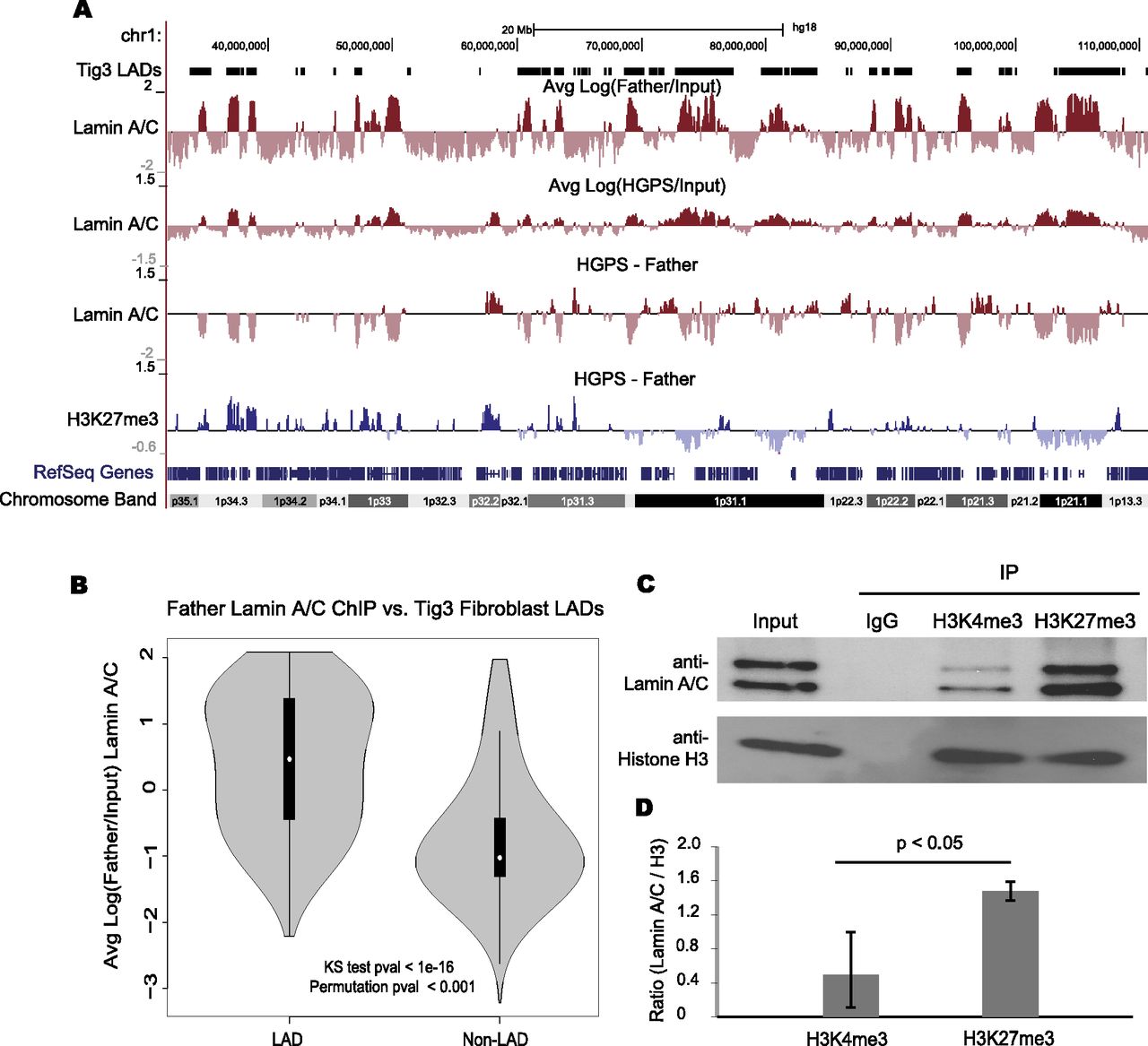 Dissociation of lamin A/C from heterochromatin regions in HGPS fibroblasts. (A) Regions of lamin A/C binding are shown as log (IP/Input) at 100-kb resolution for Father and HGPS fibroblasts along the left arm of chromosome 1. The previously classified LADs are shown above Father data (Tig3 LADs). Changes in lamin A/C binding and H3K27me3 association between Father and HGPS are shown below. (B) The distributions of lamin association signal in Father fibroblasts are shown for regions that were previously classified as LADs or non-LADs in Tig3 human lung fibroblasts. Lamin A/C ChIP-seq log ratios are significantly higher in LADs than in non-LADs as evaluated by a KS test and a circular permutation of the data (1000 permutations). (C) Western blotting analysis with anti-lamin A/C and anti-histone H3 antibodies in the immunoprecipitates with indicated antibodies. One percent of the Input and 10% of the immunoprecipitated proteins were run in each indicated lane. Three independent experiments were performed. One representative set is shown. (D) Quantification of the ratio of lamin A/C /Histone H3 of three independent replicates. There is a significant enrichment of lamin A/C in H3K27me3 ChIP compared with H3K4me3 ChIPs. P = 0.023.