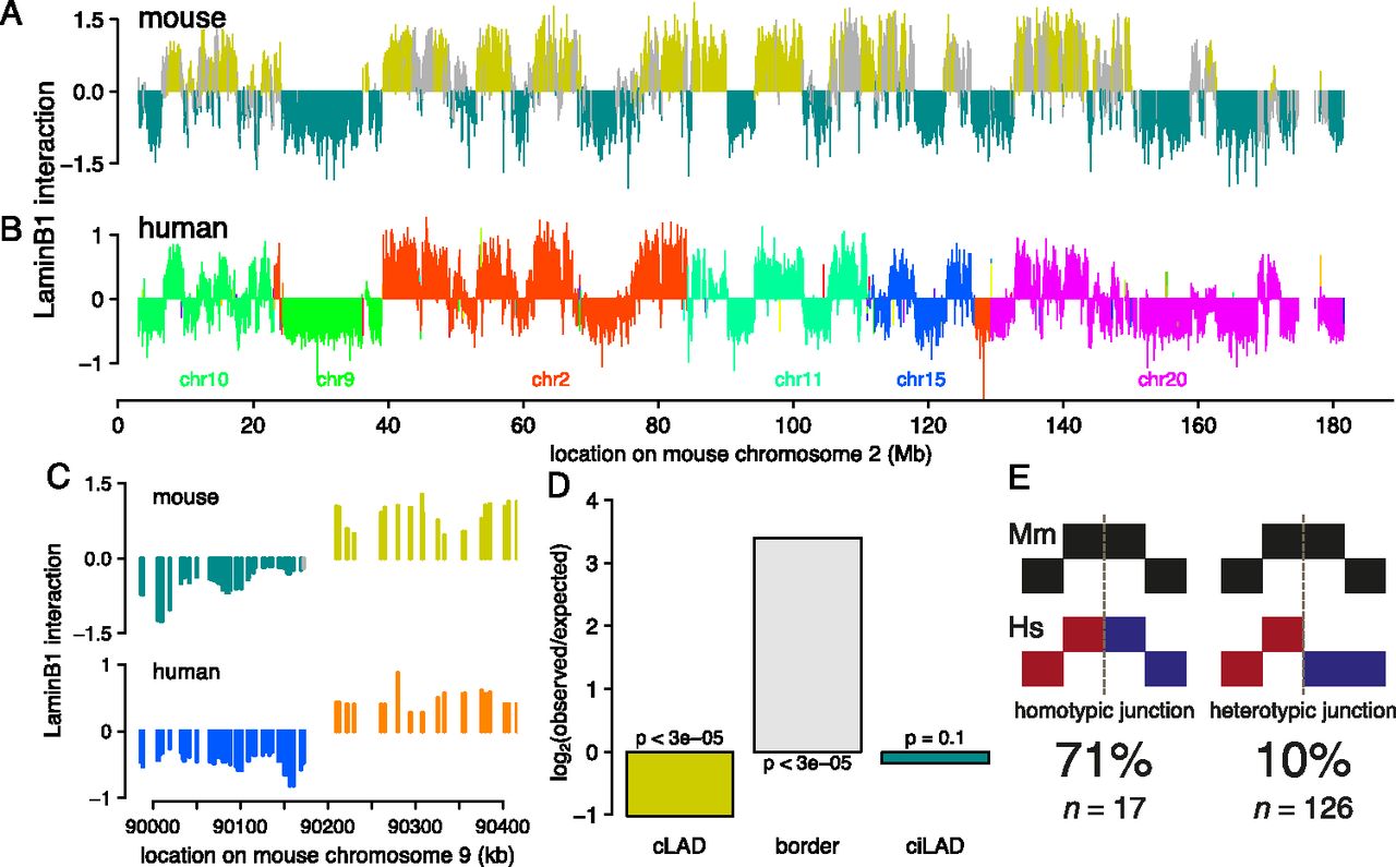 Core architecture is highly conserved between mouse and human. (A) Map of NL interactions in mouse ESCs for chromosome 2 ([mustard] cLADs; [cyan] ciLADs; [gray] fLADs), and (B) in human ESCs for the corresponding syntenic regions (each color denotes a different human chromosome). (C) Example of co-occurrence of synteny breakpoint and LAD border. Color scheme as in A and B. (D) Ratio of observed and expected occurrence of breakpoints in cLADs, ciLADs, or their border regions. (E) Cartoon representations of homotypic and heterotypic junctions; breakpoints indicated by dashed gray lines. All breakpoints in constitutive regions (n = 143) were scored based on whether they coincide with an LAD in mouse or human.