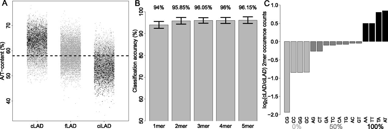 A/T content is a strong predictor of constitutive lamina association. (A) A/T content versus mean mouse lamin B1 association for a random sample of 10,000 defined cLAD, fLAD, and ciLAD regions (gray dots). (Black dots) The regions used for classification (1000 per group). (Dashed line) Genome-wide average (58%). (B) Tenfold cross-validation classification accuracies of classifiers using k-mers as predictive features, with k = 1 … 5. Bars show mean accuracies, with error bars indicating one standard deviation. (C) Log2 ratios of occurrence counts in cLAD versus ciLAD regions for each dinucleotide. Bar shading indicates the A/T content of dinucleotides.