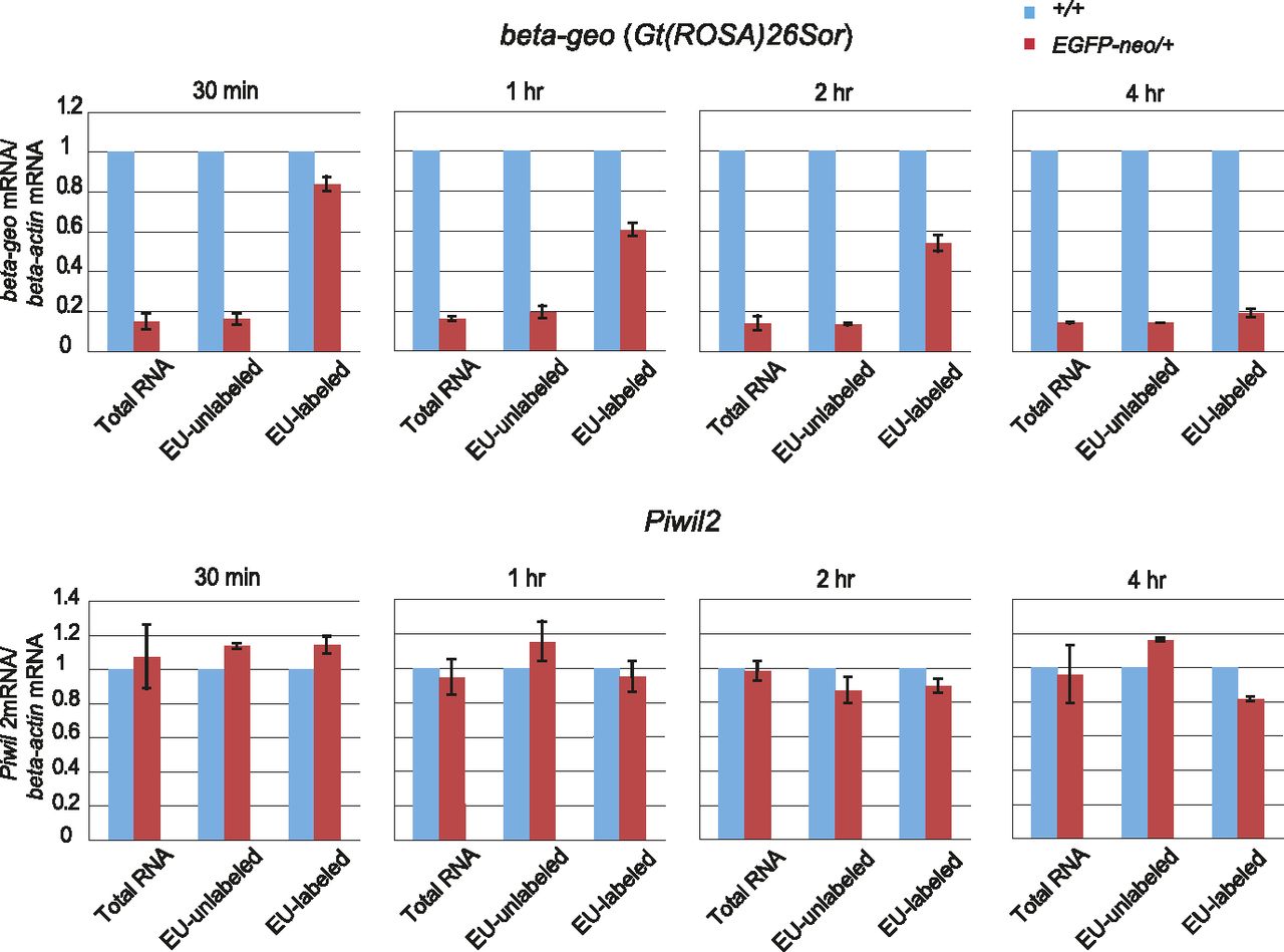 Reduced stability of beta-geo mRNA in EGFP-neo/+ testes. Newly synthesized RNA was pulse-labeled with EU in testicular germ cells collected at 5 wk after birth, and RNA was isolated for qRT-PCR at the indicated time point after the withdrawal of EU. The level of beta-actin mRNA was used as a reference. Error bars indicate SDs of four biological replicates.