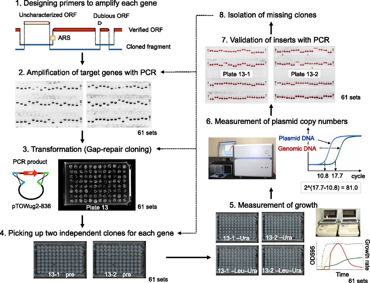 Scheme of genome-wide analysis of protein-coding genes in S. cerevisiae with gTOW (gTOW6000). Each step of gTOW6000 is shown. For steps 2–7, the representative data of plate no. 13 are given as an example. The details of each step are described in Methods.