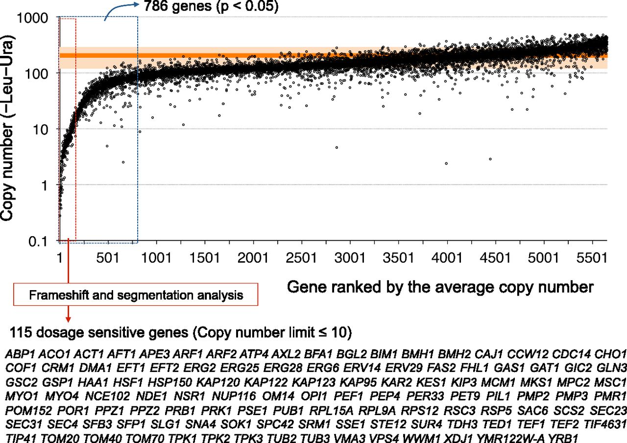 Copy number limits (CNLs) of S. cerevisiae genes determined by gTOW analysis. Genes were ordered according to their average copy number determined by gTOW under the −Leu−Ura condition. Each gene has two data points because of the duplication of the experiment. The orange line and the transparent zone around the line indicate the average copy number with the empty vector and the standard deviation, respectively. Genes that showed significantly lower limits than those observed in the vector experiments (786 genes, P < 0.05) are surrounded by the blue dotted rectangle. Genes with CNLs of 10 and less (dosage-sensitive genes [DSGs]) are surrounded by the red-dotted rectangle. A confident set of DSGs isolated after frameshift and segmentation analyses (Fig. 4) is shown. The entire data set is given in Supplemental Table S1.