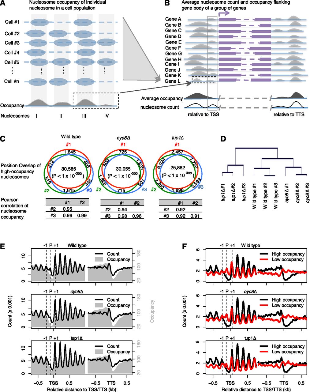 Nucleosome position and occupancy analysis based on high-quality maps enable observation of a P nucleosome on promoters. (A) A cartoon to show nucleosome position and occupancy analysis at a single genomic locus in a cell population. Theoretically, nucleosomes (blue ovals) may be located anywhere on a DNA fragment (blue solid line); “nucleosome occupancy” refers to the frequency at which nucleosomes present at a specific position. Technically, nucleosome occupancy can be measured by local sequencing depth (gray area under curve) at each nucleotide across the genome, and nucleosomes (gray bars) can be defined as occupancy peaks whose sizes are close to a nucleosome unit length. (Blue dash lines) Copies of the same DNA fragment in different cells as labeled on left. (B) A cartoon to show nucleosome position and occupancy analysis relative to a putative gene group. When grouping nucleosomes based on a common genomic feature such as a transcription start site (TSS) or transcription terminal site (TTS), a group of nucleosomes (gray solid box) with high nucleosome count (solid curve) might not be observable due to lower average occupancy (black area under curve) relative to neighboring nucleosomes. (Purple bars and dashed lines) Different genes (labeled on left); (purple arrow) the transcription direction and TSS. (Blue solid lines) Genomic regions flanking a gene group. (Black dash boxes in A and B) The same putative genomic locus. (C) Venn diagrams representing the overlap of high-occupancy nucleosomes between replicates, with the Pearson correlation coefficients of nucleosome occupancy between replicates shown below. All nucleosomes are used for calculation of Pearson correlation coefficients, whereas the 50% nucleosomes ranked by occupancy were retrieved for estimation of position overlap, with the overlapping P-value estimated based on Fisher's exact test. (D) Hierarchical clustering of all nine samples based on nucleosome occupancy. The top 5% of nucleosomes ranked by standard deviation of occupancies among the nine samples were used in the unbiased clustering. (E) Average nucleosome occupancy and count plotted as a function of distance to the TSS or TTS. (F) Average nucleosome count of high- and low-occupancy nucleosomes plotted as a function of distance to the TSS or TTS.
