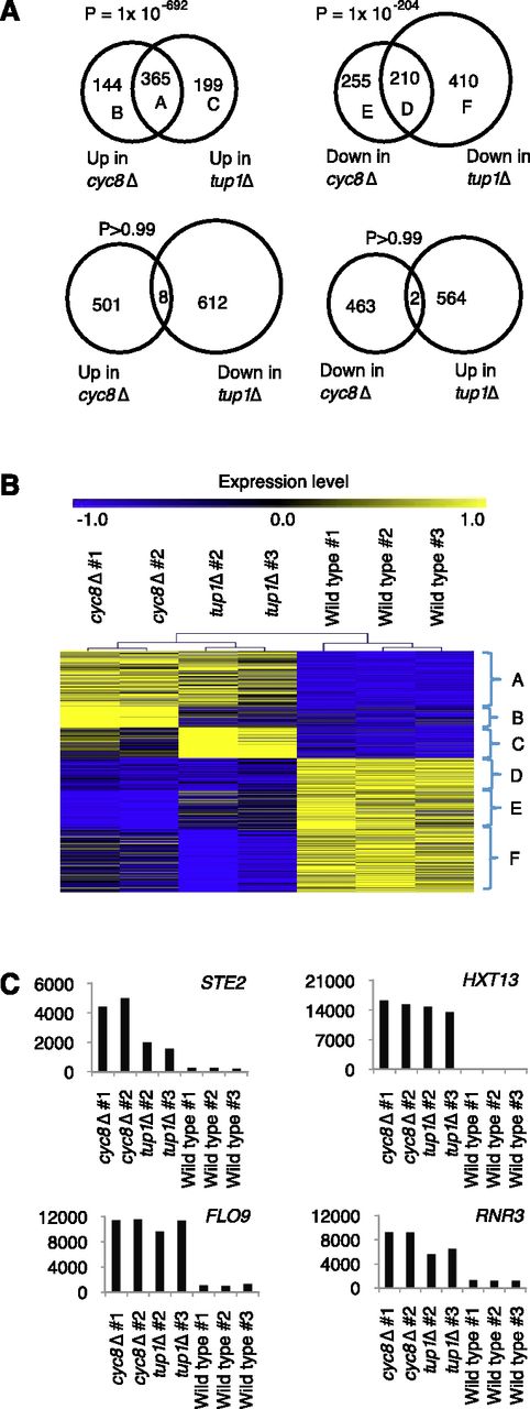 Cyc8 and Tup1 show common and individual global effects on transcriptional regulation. (A) Venn diagram showing the overlap of regulated genes (Q-value <0.05; fold change >1.5) in cyc8Δ or tup1Δ strain relative to wild-type strain. The overlap P-value is estimated based on a Fisher's exact test. (B) A heat map to show gene expression level in each sample. Each row represents a differentially expressed gene in the cyc8Δ or tup1Δ strain relative to the wild-type strain, and each column represents a sample. Samples were hierarchically clustered, and the expression values for each gene from all seven samples were scaled to a range between −1 and 1. Nucleosomes were grouped and labeled based on the Venn diagrams in A. (C) Histograms showing expression levels of four known Cyc8–Tup1 target genes in cyc8Δ, tup1Δ, and wild-type strains.
