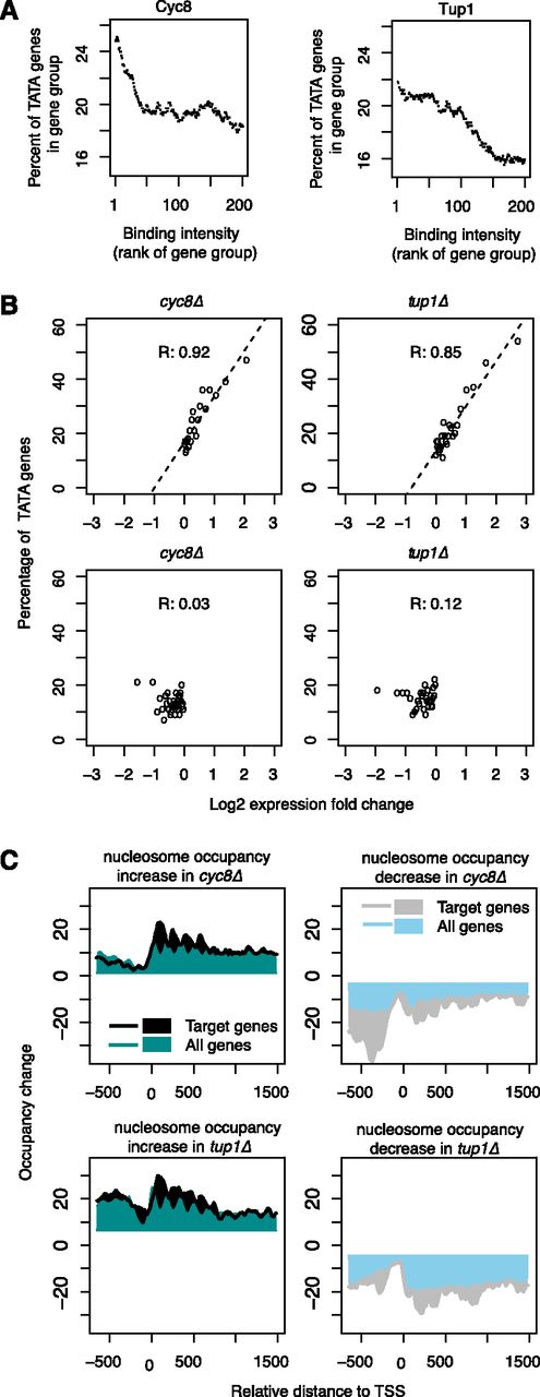 The Cyc8–Tup1 complex regulates TATA-containing genes via nucleosome organization. (A) Frequency of TATA-containing genes plotted as a function of Cyc8 or Tup1 binding intensity. We ranked the genes by Cyc8 or Tup1 binding intensity from highest to lowest, and use 1000-gene sliding windows in 10-gene increments down each rank to produce overlapping groups. Then the percentage of TATA-containing genes in each group was calculated. (B) Frequency of TATA-containing genes plotted as function of fold expression change in the cyc8Δ or the tup1Δ strain relative to the wild-type strain. Genes were ranked based on the expression fold change and grouped into 100-gene bins with no overlap between any two bins. The fraction of the TATA-containing genes in each bin was plotted against the corresponding average gene expression fold change. Correlation coefficients were calculated based on the Spearman method. Up-regulated genes (top panels) and down-regulated genes (bottom panels) were analyzed separately. (C) Nucleosome occupancy change plotted as function of distance to transcription start sites of either all yeast genes or Cyc8–Tup1 target genes, as defined by Cyc8–Tup1 binding and expression change upon loss of these factors. Nucleosome occupancy increases (left panels) and occupancy decreases (right panels) were analyzed separately.