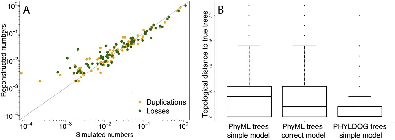 (A) Correlation between the expected and reconstructed numbers of duplications and losses per gene and per branch of the species tree. The x = y line is in gray. (B) Topological (RF) (Robinson and Foulds 1979) distance to the true gene family trees of the trees reconstructed by PHYLDOG under a simpler model of sequence evolution (JC69) than that used in the simulation (HKY85 with rate heterogeneity among sites) and by PhyML under the same simple model and under the correct model of evolution. For PHYLDOG, the median RF distance to the true tree is at 0.