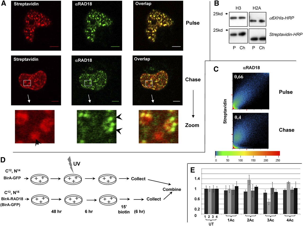 The RAD18-specific pattern changes after the proximity with RAD18 has been diminished. (A) Decrease in colocalization between RAD18 and biotinylated chromatin after a 6-h chase. (Top) Confocal microscopy showing strong colocalization between RAD18 and biotinylated chromatin in the nucleus of 293T cells immediately after pulse-labeling. (Middle) Confocal microscopy showing different localization of RAD18 and biotinylated chromatin 6 h after pulse-labeling. (Bottom) Zoomed area from the chase sample showing an example of biotinylated foci that do not colocalize with the RAD18 foci, and vice versa (indicated by arrows). (B) No increase in biotinylation signal after chase. Western analysis showing that the level of biotinylation of BAP-H3 and BAP-H2A is not increased 6 h after the cells have been washed free of biotin. (Top) α-6×His antibody. (Bottom) Strepavidin-HRP. (P) Pulse sample, (Ch) chase sample. (C) Scatter plot with the coefficient of correlation (top left corner) between the intensities of the red and green signals for every pixel (above a background threshold), showing stronger colocalization of the biotin and RAD18 signals in the pulse sample. (D) Scheme of the pulse-chase experiment. Cells grown in light SILAC medium are transfected by BirA-GFP and BAP-H2A (reference sample). Cells grown in heavy SILAC medium are transfected with BirA-RAD18 (or BirA-GFP) and BAP-H2A. The heavy labeled cells are either harvested immediately after biotin labeling or washed to remove biotin and left for 6 h before harvest. The heavy and light labeled cells are then mixed, and chromatin is prepared as in Figure 2C. (E) Acetylation status of H4 N-terminal tails. The analysis was performed and is presented as described in the legend of Figure 2D. The heavy isotope-labeled cells were: (lane 1) BirA-GFP + BAP-H2A pulse; (lane 2) BirA-GFP + BAP-H2A chase; (lane 3) BirA-RAD18 + BAP-H2A pulse; (lane 4) BirA-RAD18 + BAP-H2A chase. The light isotope-labeled cells were always transfected with BirA-GFP + BAP-H2A and pulse-labeled with biotin, as in sample 1.