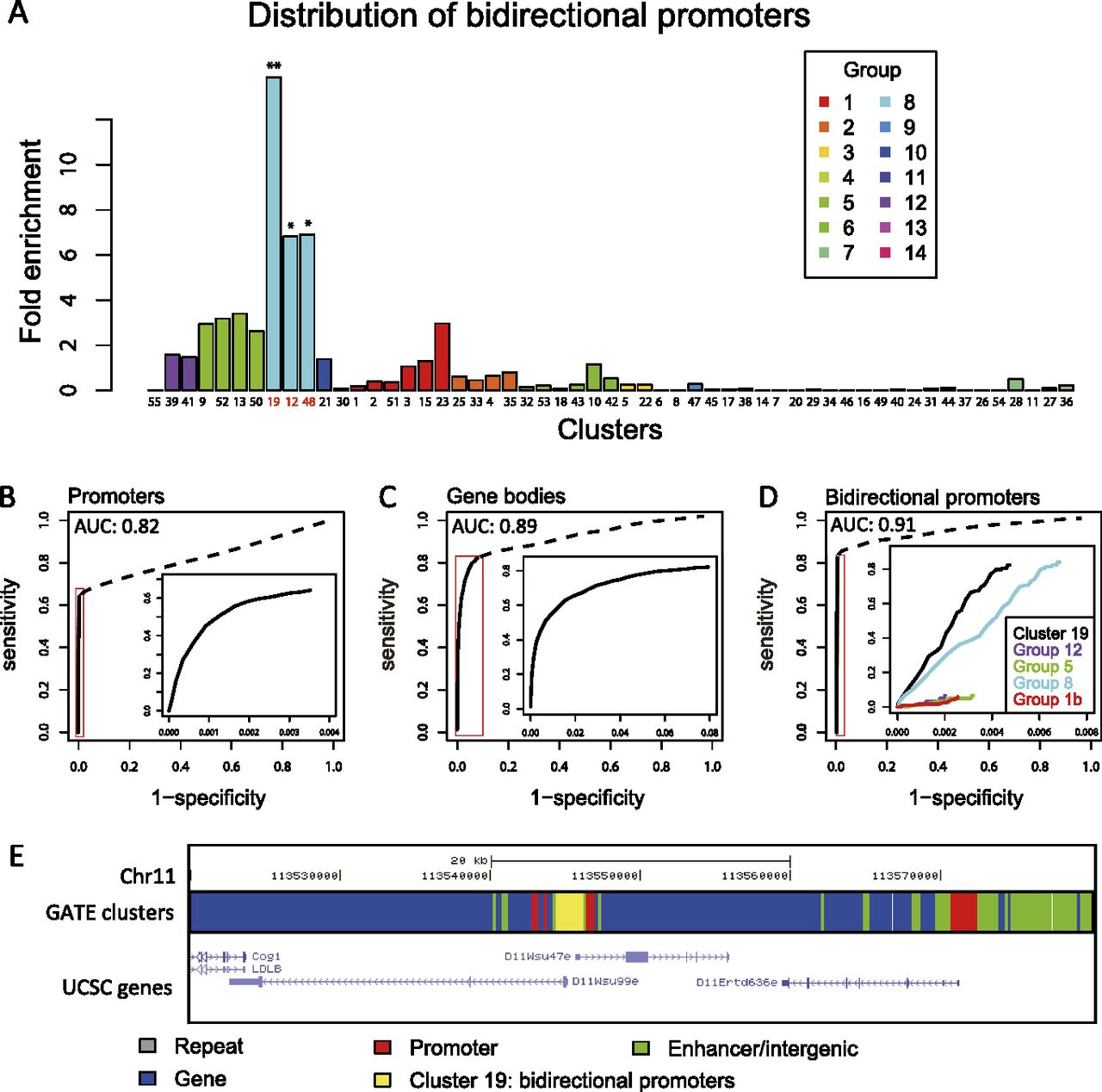 Predicting genomic features. (A) Distribution of bidirectional promoters in the 55 epigenomic clusters. Fold enrichment indicates the ratio between the percentage of bidirectional promoters in a cluster and the average percentage of all clusters. (*) P < 10−60; (**) P < 10−90. (B–D) Accuracies of predicting genomic features as measured by receiver operating characteristic (ROC) curves. AUC indicates area under the curve. Promoters were predicted by groups 1b, 5, 8, and 12 (P < 2.2 × 10−16, Wilcoxon test). Gene bodies were predicted by groups 1a, 4, 10, and 11 (P < 2.2 × 10−16). Bidirectional promoters were predicted by cluster 19 (P < 2.2 × 10−16). (Insets) Details of the high specificity regions. (E) A predicted bidirectional promoter and a regular promoter. Along a fraction of chromosome 11, each genomic segment is colored by the cluster it belonged to. The stretch of DNA belonging to cluster 19 (yellow) corresponded to a bidirectional promoter.