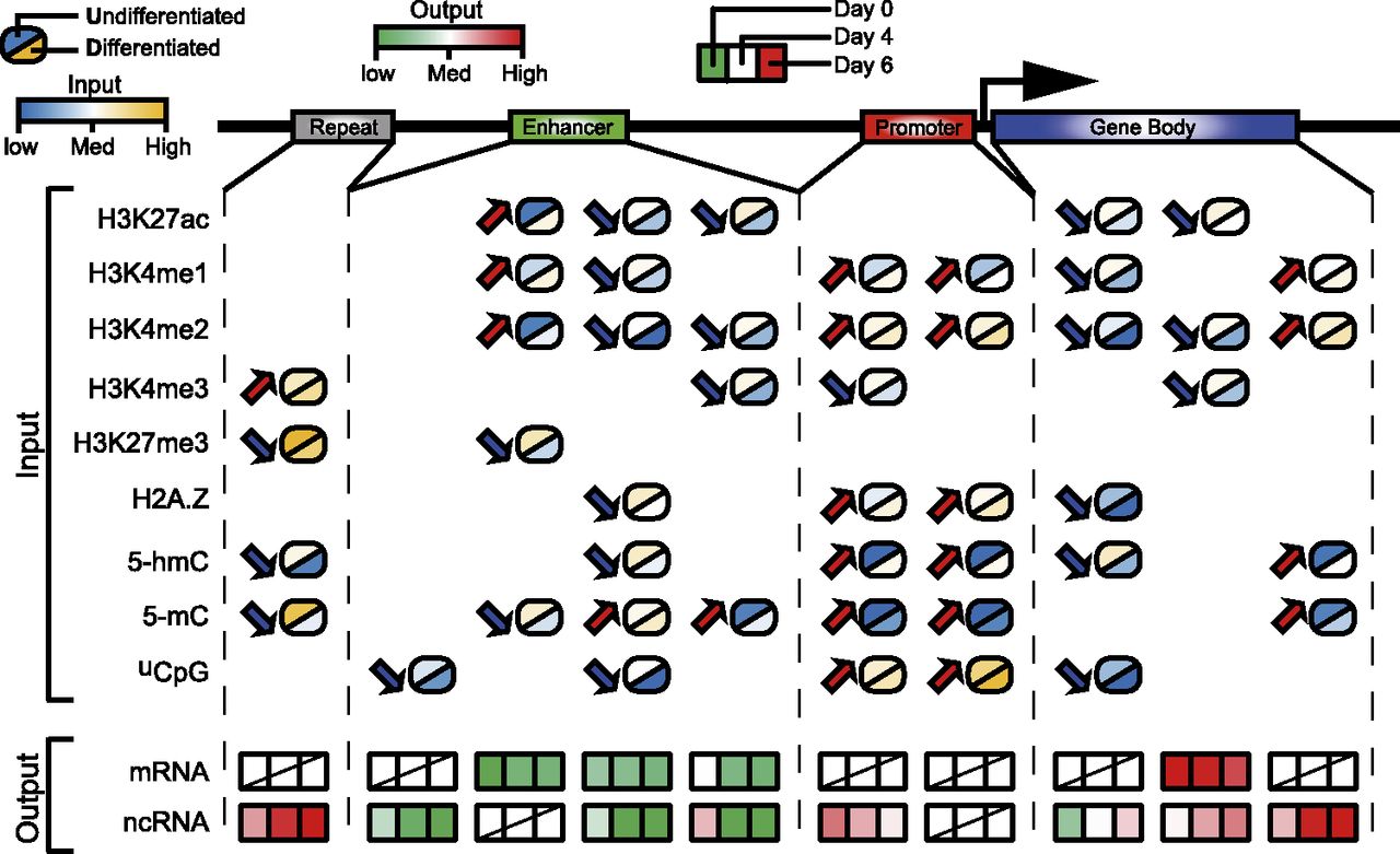 A model for combinatorial epigenomic changes and gene expression. One to several combinatorial patterns (columns) were identified on each genomic feature. The model-learned intensity levels for each epigenomic mark (input rows) in the undifferentiated state and the differentiated state are color-coded, and the directions of change are marked by arrows. The corresponding temporal changes of mRNA and ncRNA expression are color-coded in a green-to-red scale (output rows).