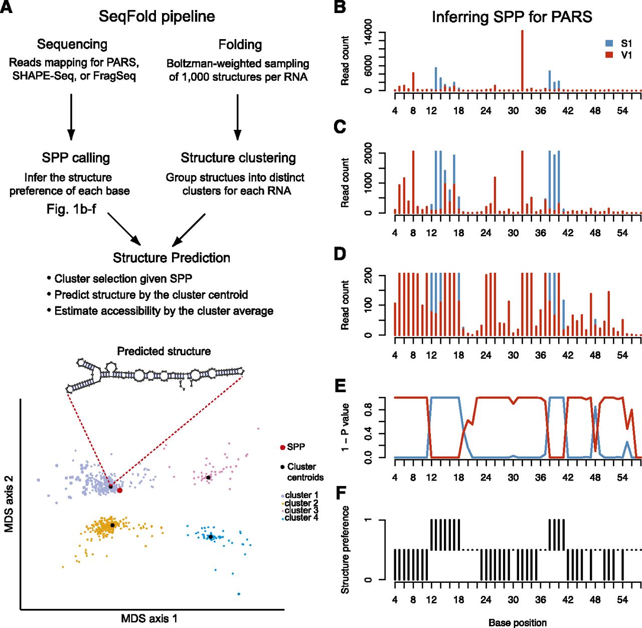 Framework of the SeqFold method. (A) The flowchart of integrated prediction of RNA secondary structure. On one hand, sequencing reads that contain RNA structure information are mapped, followed by the inference of structure preference for each base. The structure preferences of all informative bases of a transcript define the structure preference profile (SPP). On the other hand, 1000 structures per transcript are generated from the Sfold Boltzman sampling procedure and grouped into distinct clusters (Ding and Lawrence 2003; Ding et al. 2005, 2006). At the structure prediction stage, nearest neighbor classification is used to identify a specific structure cluster given an SPP. The centroid of the selected cluster is taken as the predicted structure and the average of the sample structures in the cluster gives the accessibility of each base. The bottom panel demonstrates the clustering pattern in the multidimensional scaling surface. (B–F) Illustration of the SPP calling process for PARS. (B) The read counts of RNase S1 and V1 along the P9-9.2 domain of the Tetrahymena ribozyme (Guo et al. 2004). C as B showing a maximal read count of 2000. D as B showing a maximal read count of 200. (E) The (1 - P-value) profile of hypergeometric test for each base. (F) Structure preference calls with FDR 0.05.