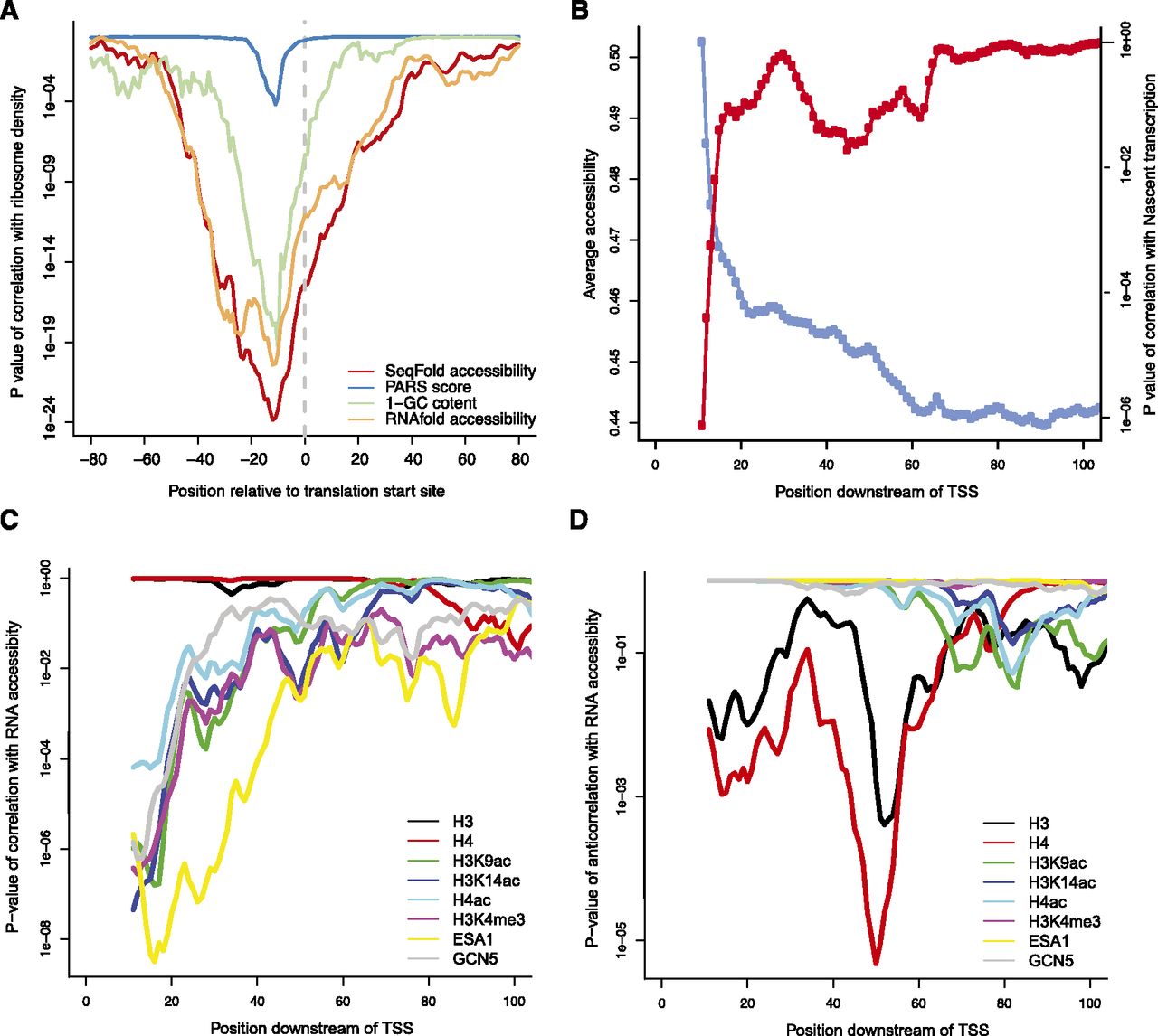 Implications of SeqFold-derived RNA accessibility on translation efficiency and transcription initiation. (A) RNA accessibility around the translation start site positively correlates with ribosome density, a proxy of translation efficiency (Ingolia et al. 2009). Shown are the P-values of the Spearman correlation between average accessibility in a 30-bp-wide window and the ribosome density. Also shown are the relationship of ribosome density with the raw PARS signal (Kertesz et al. 2010), RNA accessibility calculated directly from RNAfold without experimental information, and GC content of the sequences. (B) The average accessibility increases near the 5′ end of a transcript and positively correlates with Pol II density, a proxy of nascent transcription (Churchman and Weissman 2011). Shown are the average accessibilities in a 20-bp-wide window sliding from the TSS (blue) and the P-values of the Spearman correlation with the average Pol II density calculated from the [40, 100] region (red). (C) The 5′ end accessibility of a transcript positively correlates with histone modifiers and chromatin remodeling enzymes (Pokholok et al. 2005) but not nucleosome occupancy (Pokholok et al. 2005). Shown are the P-values of the Spearman correlations between the average accessibility in a 20-bp-wide window sliding downstream of TSS and various histone marks. (D) The 5′ end accessibility of a transcript negatively correlates with nucleosome occupancy at ∼50 bp downstream of TSS. Shown are the P-value of the anticorrelations between the average accessibility in a 20-bp-wide window sliding downstream of TSS and various histone marks. The data points are the centers of the windows.