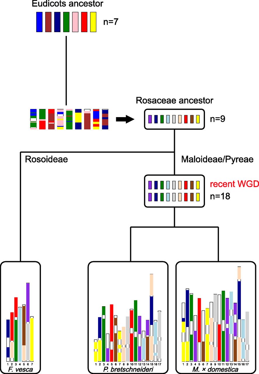 The evolutionary scenario of nine chromosomes of the Rosaceae ancestor. Pear and apple have the same chromosome karyotypes and same chromosomal evolution mode. The Pyreae tribe went through a recent WGD. The Amygdaleae tribe, such as strawberry in the Rosoideae subfamily, has no recent WGD but has chromosome fragmentation and recombination from nine to seven. It is estimated that the ancestor of Rosaceae had nine chromosomes. To demonstrate the evolutionary process from the eudicot ancestor to the Rosaceae ancestor, strawberry was compared with grape.