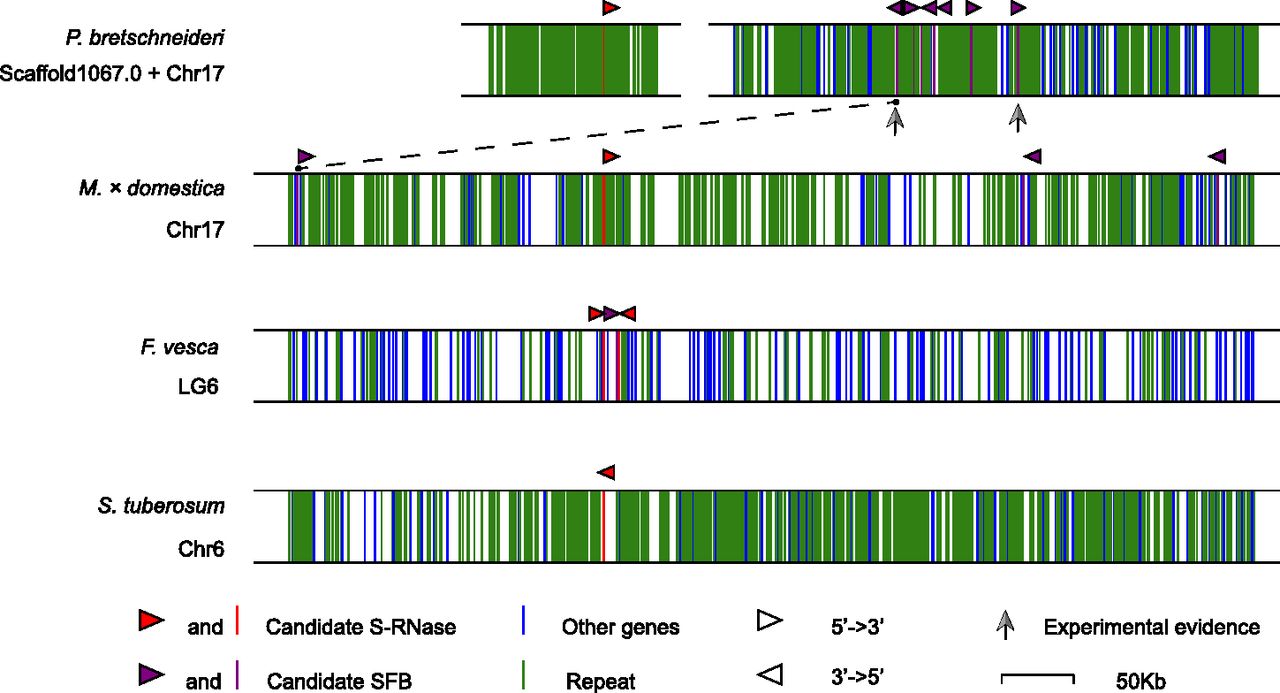 Genes and repeat sequences surrounding candidate S-RNase genes in pear, apple, strawberry, and potato. The dashed line with dot endpoints connects candidate SFB genes of pear and apple that share the highest sequence identity (which are shown in Supplemental Table 10). (Gray arrow) Genes supported by experimental evidence. The vertex of the triangles is the 3′ orientation of the particular gene: (red) candidate S-RNase gene; (purple) candidate SFB gene; (blue) other genes in the neighboring regions; (green) repeat sequence.