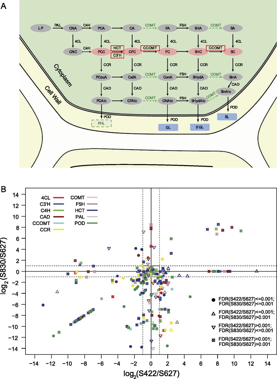 (A) The phenylpropanoid biosynthesis pathway in pear that influences the conformation of stone cells in fruit. (Red box) Genes that had detectable expression; (light red shaded ovals) important intermediate compounds in lignin pathway; (green text and arrows) pathways with minor expression; (blue boxes) three important end-product compounds in pear fruit; and green-boxed compound cannot be detected. (B) Transcript ratio distribution of all enzymes related to lignin. Three stages of fruit development (S422, early development; S627, middle development; and S830, near ripening) were assessed. The ratio of S422 and S627 is shown along the x-axis, and the ratio of S830 and S627 is shown along the y-axis. For points, different colors correspond to different enzymes, while different shapes correspond to different conditions of false-discovery rate (FDR) values. Abbreviations of genes involved in phenylpropanoid biosynthesis pathway are as follows: LP, L-phenylalanine; CAN, cinnamic acid; PCA, P-coumaric acid; CA, caffeic acid; FA, ferulic acid; 5HA, 5-hydroxyferulate acid; SA, sinapic acid; CNC, cinnamoyl-CoA; PCC, p-coumaroyl-CoA; CFC, caffeoyl-CoA; FC, feruloyl-CoA; 5HC, 5-hydroxyferuloyl-CoA; SC, sinapoyl-CoA; PCouA, p-coumar aldehyde; CafA, caffeyl aldehyde; ConA, conifer aldehyde; 5HydA, 5-hydroxyconifer aldehyde; SinA, sinapoyl aldehyde; PCAlc, p-coumaryl alcohol; CFAlc, caffeyl alcohol; CNAlc, coniferyl alcohol; 5HydAlc, 5-hydroxyconiferyl alcohol; SinAlc, sinapyl alcohol; PHL, p-hydroxyphenyl lignin; GL, guaiacyl lignin; 5GL, 5-hydroxy-guaiacyl lignin; SL, syringyl lignin; PAL, phenylalanine ammonia-lyase; C4H, trans-cinnamate 4-monooxygenase; 4CL, 4-coumarate-CoA ligase; HCT, shikimate O-hydroxycinnamoyltransferase; C3′H, coumaroylquinate 3′-monooxygenase; COMT, caffeic acid 3-O-methyltransferase; CCOMT, caffeoyl-CoA O-methyltransferase; F5H, ferulate-5-hydroxylase; CCR, cinnamoyl-CoA reductase; CAD, cinnamyl-alcohol dehydrogenase; and POD, peroxidase.