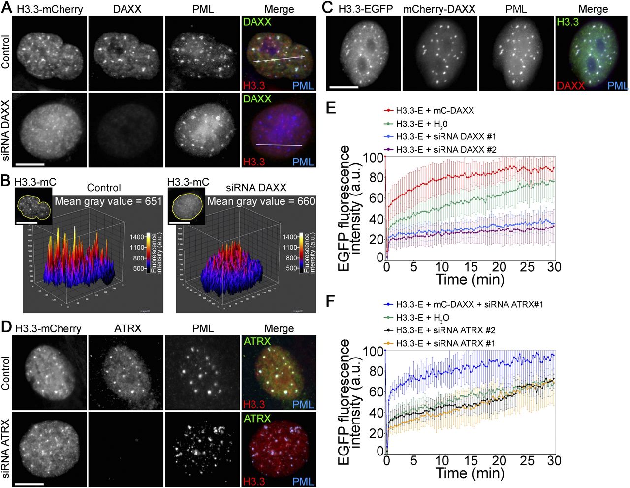 Down-regulation of DAXX, but not ATRX, abolishes recruitment of H3.3 to PML bodies. (A) Immunolocalization of DAXX and PML in cells expressing H3.3-mC, after sham (control) or siRNA-mediated DAXX knockdown. (B) Distribution of H3.3-mC fluorescence in a sham (control)– and DAXX-depleted cell (shown in inset, corresponding to H3.3-mCherry pictures in A). (C) Colocalization of coexpressed H3-3-EGFP and mC-DAXX with immunolabeled PML. (D) Immunolocalization of ATRX and PML in cells expressing H3.3-mC, after sham (control) or siRNA-mediated ATRX knockdown. (E) FRAP analysis of H3.3-EGFP in cells expressing mC-DAXX, in cells depleted of DAXX using two different siRNAs, and in sham-depleted cells (H2O) (mean ± SD of 10–14 cells). (F) FRAP analysis of H3.3-EGFP in ATRX-depleted (using two different siRNAs) and sham (H2O)–depleted cells, and in cells expressing mC-DAXX and depleted of ATRX (mean ± SD of seven cells). Scale bars, 10 μm.