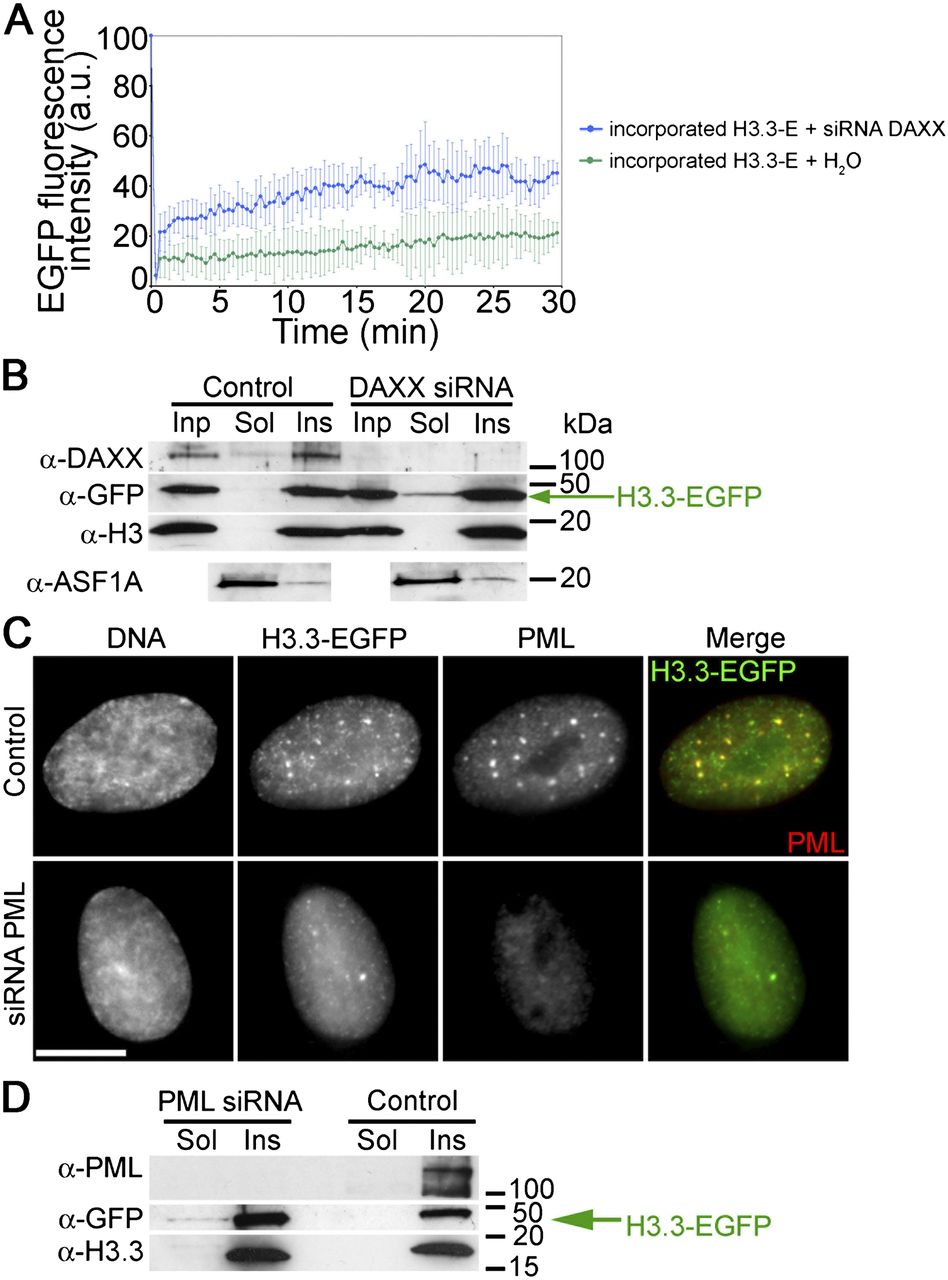 DAXX down-regulation generates a soluble pool of H3.3. (A) FRAP analysis of H3.3-EGFP incorporated into chromatin in DAXX- and sham (H2O)–depleted cells 96 h after transfection (mean ± SD of five cells). (B) Western blot analysis of H3.3-EGFP distribution in DAXX- and sham (control)–depleted cells. Cell lysates (Inp, input) were fractionated into 1% Triton X-100 soluble (sol) and insoluble (Ins) fractions. H3.3-EGFP is detected with anti-GFP antibodies. H3 is shown as a chromatin marker. ASF1A is shown as a marker of the soluble fraction. (C) Redistribution of H3.3-EGFP after siRNA-mediated knockdown of PML. (D) Western blot analysis of H3.3-EGFP distribution in Triton X-100 soluble and insoluble fractions, from PML- and sham (control)–depleted cells. Cell lysates were fractionated as in B.