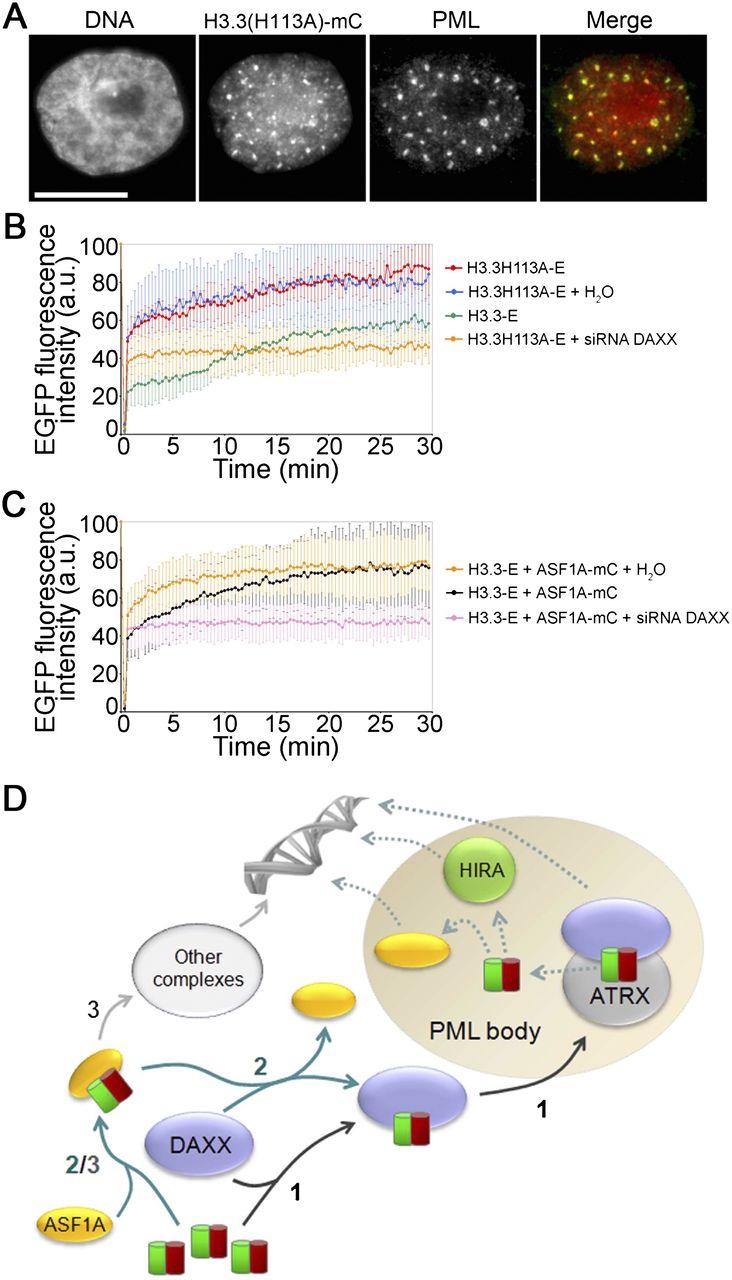 Accelerated recruitment of an (H3.3–H4)2 tetramerization mutant to PML bodies. (A) Colocalization of an H3.3(H113A)-mC tetramerization mutant with immunolabeled PML, 24 h after transfection. (B) FRAP analysis of H3.3(H113A)-EGFP in NBs with and without siRNA-mediated down-regulation of DAXX. H3.3-EGFP recovery was examined in parallel as control. H3.3(H113A)-EGFP displays a greater soluble pool than H3.3-EGFP, and recovery at NBs is abolished by DAXX knock-down (see Supplemental Fig. 7A for fluorescence recovery of the soluble fraction and at NBs) (mean±SD of 7-14 cells). (C) FRAP analysis of H3.3-EGFP in NBs in cells expressing ASF1A-mC with or without siRNA-mediated DAXX knock-down (mean±SD of 10-17 cells). (D) Model of (H3.3–H4) dimer recruitment to PML bodies prior to chromatin deposition. In pathway 1, DAXX recruits the (H3.3–H4) dimer to PML bodies. This process is facilitated by ASF1A (pathway 2). (H3.3–H4) loaded onto ASF1A can also be brought to additional H3.3 chaperone containing complexes (Szenker et al. 2011) (pathway 3). DAXX, ATRX, HIRA, and ASF1A are localized in a proportion of PML bodies and may speculatively be available for loading (H3.3–H4) prior to deposition into chromatin (dashed arrows).