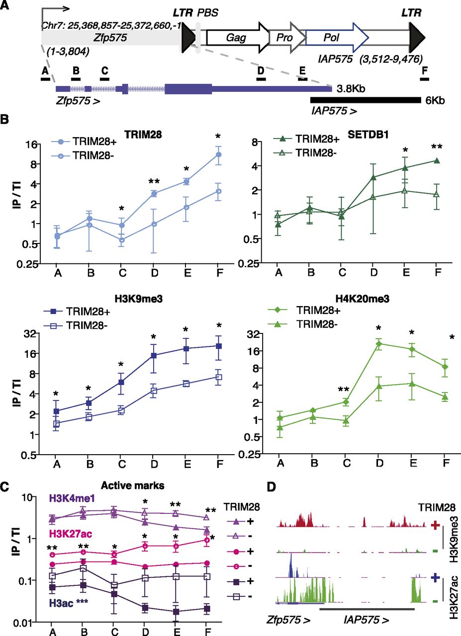Zfp575 is regulated by a gain of active chromatin marks at its adjacent IAP575. (A) Map of Zfp575 and its adjacent IAP575 (for details, see Fig. 3A) with an enlargement shown underneath to show where primer pairs for ChIP are located. (B) ChIP results of repressive marks. (IP/TI) Immunoprecipitate values were normalized to their respective total inputs and to Gapdh. Bars represent the mean and SD of three to four ChIPs per antibody, and experiments were also reproduced in another ES cell line (Rex1) (data not shown). In each experiment, controls of no antibody were included giving no enrichments. Differences between WT and TRIM28-depleted samples were assessed for each primer set using paired t-tests with all significant differences given; (*) P ≤ 0.05, (**) P ≤ 0.01. (C) ChIPs this time on active marks were performed as described in B with data representing three to four ChIPs per antibody. Additionally, here the Pou5f1 enhancer was used as a positive control (data not shown) showing high enrichment for both H3K4me1 and H3K27ac but not for TRIM28 or H3K9me3. For H3K4me1 and H3K27ac, all significant differences are shown for each primer set, while for H3ac, WT samples were significantly different from TRIM28-depleted ones, not for individual points but over all primer sets; (***) P ≤ 0.001. (D) ChIP-seq maps of H3K9me3 and H3K27ac in TRIM28 WT and depleted ES cells (set to the same vertical scale) at the Zfp575-IAP575 locus. Note that reads within ERVs, especially conserved ones (in black), are usually missing due to the inability to map reads within highly repeated sequences. However, reads are present at the borders of these elements.