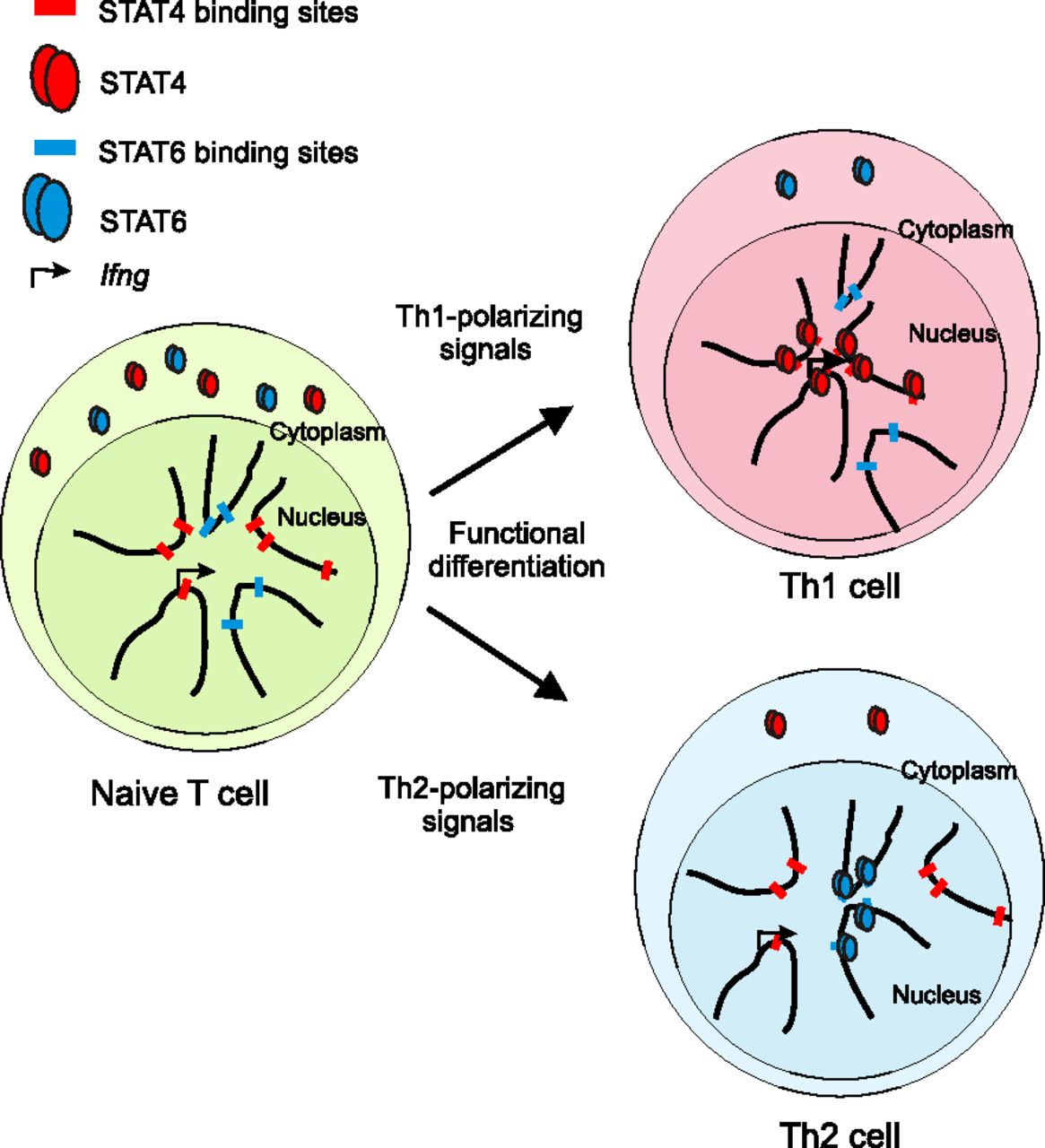Selection of contact loci during Th1 differentiation favoring spatial clustering of STAT4 binding sites. A model depicts the transition of the subnuclear interactome of Ifng during Th1 differentiation. In the naive progenitor cells, Ifng is silenced and has promiscuous contacts. Th1-inducing cytokines activate STAT4, and the transcription factor binds to regulatory elements in the genome. Ifng interactome is reorganized predominantly by retaining and strengthening contacts that harbor STAT4 binding sites. The resulting subnuclear environment of Ifng in Th1 supports a high local concentration of STAT4 and other cooperating factors.