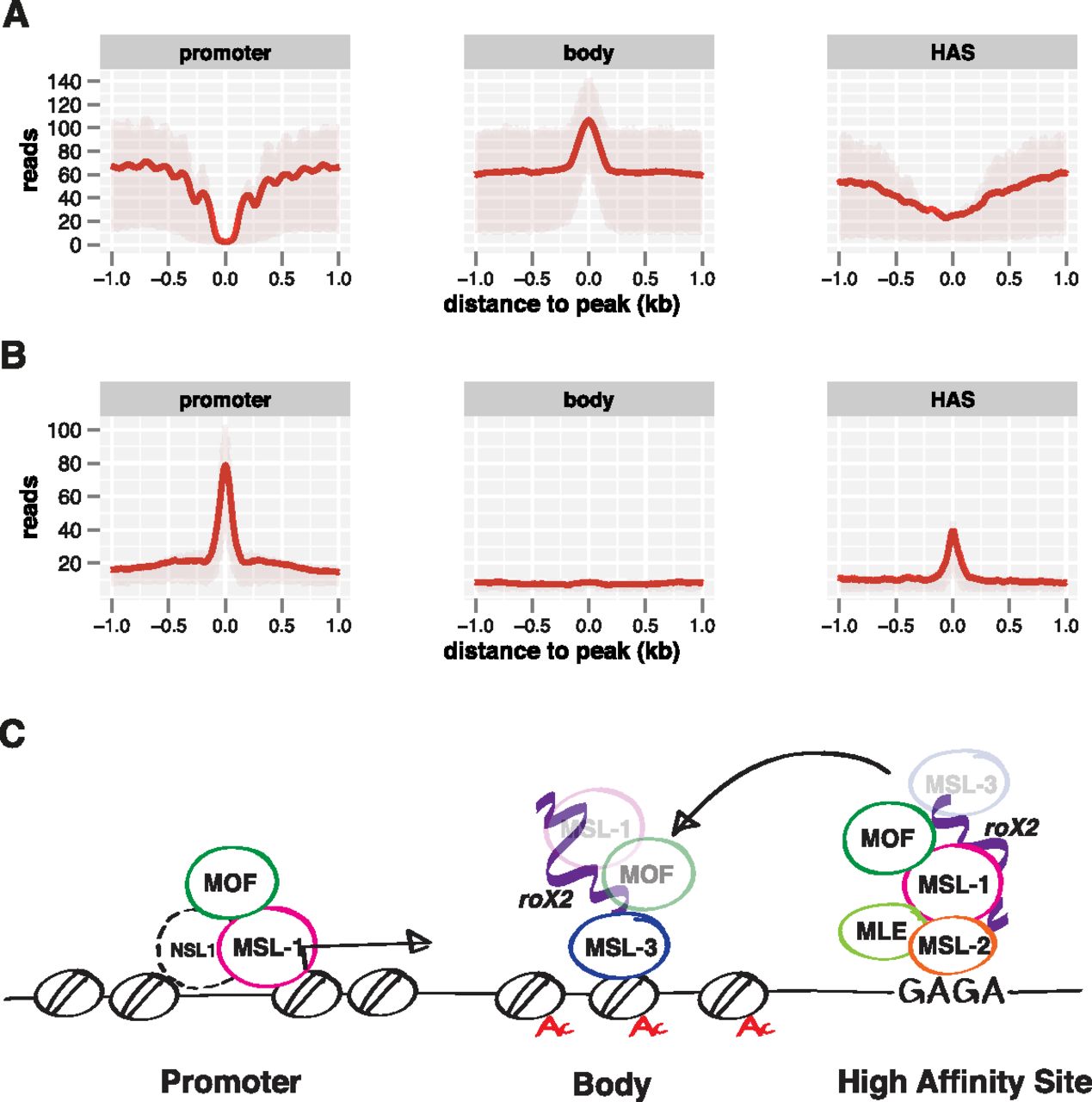Different modes of MSL protein binding in different chromatin contexts. (A) Nucleosome reads along MSL-1 peaks on promoters, MSL-3 peaks on gene bodies, and HAS as derived from MNase-seq data. Shaded areas above and below the solid lines describe the interquartile range of enrichment. (B) DNAse hypersensitivity along MSL-1 peaks on promoters, MSL-3 peaks on gene bodies, and HAS as derived from DNase-seq data (modEncode). Shaded areas on top and bottom of the solid lines describe the interquartile range of enrichment. (C) MSL complex architecture on three classes of binding sites as defined by high-resolution NGS mapping.
