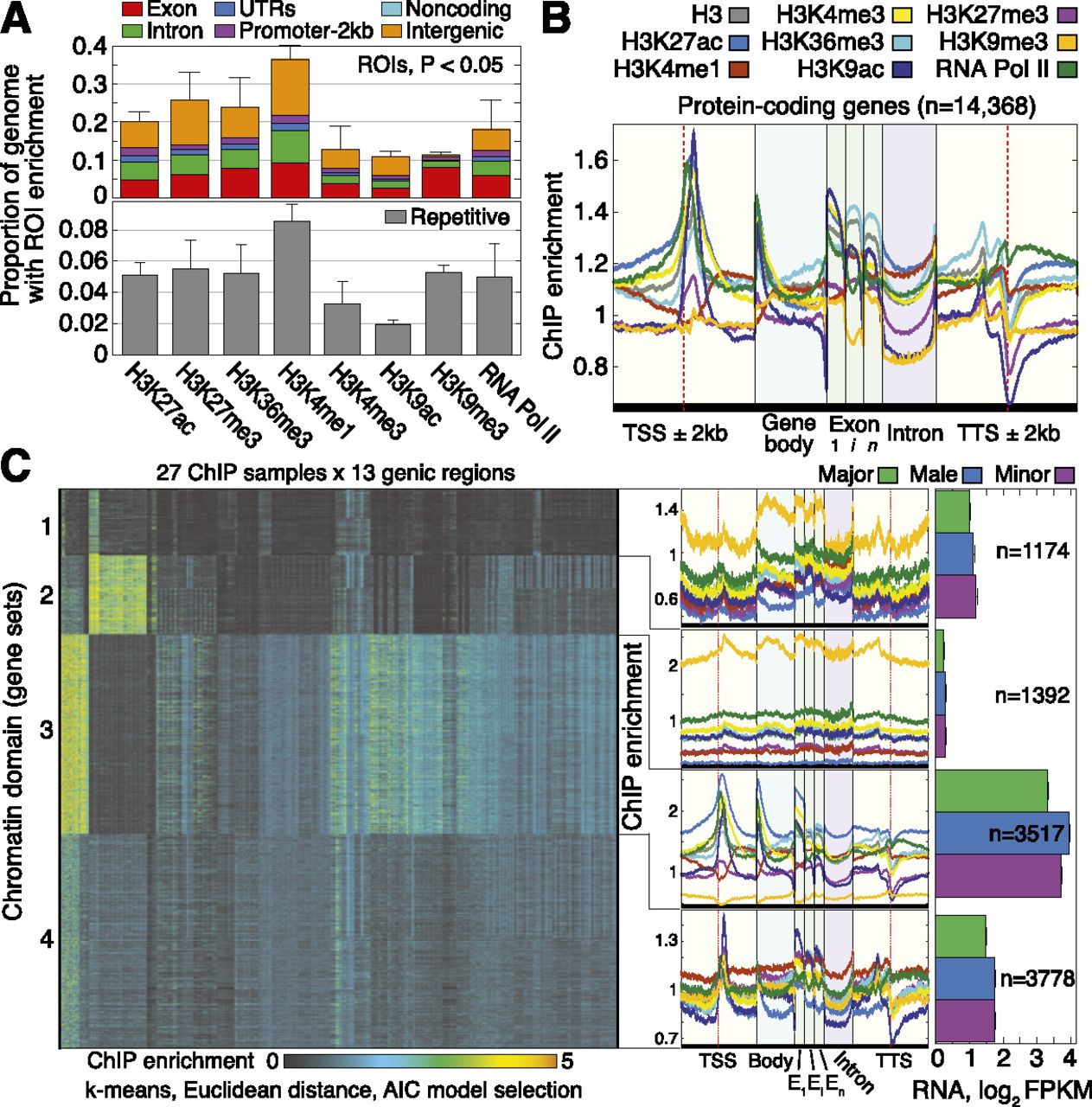 grouped by hierarchical clustering with a Euclidean distance measure. (Middle) ChIP enrichment profiles averaged over gene loci from each chromatin domain. On right, average expression levels for genes in each chromatin domain, separated by caste. Error bars denote SE over genes. (FPKM)
