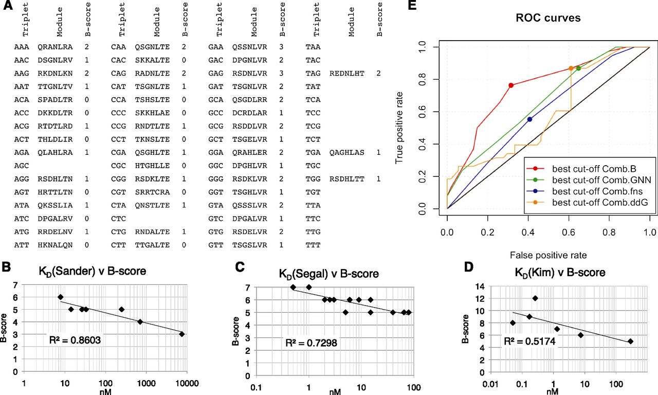 The ab initio B-score as a predictor of relative affinity and activity of MA ZFNs. (A) The B-scores are shown for each Barbas zinc-finger module (Bhakta and Segal 2010). B-scores were summed and compared to the measured affinities of (B) seven three-finger arrays (Sander et al. 2009); (C) 16 three-finger arrays (Segal et al. 1999); and (D) six six-finger arrays of mixed composition (MS Kim et al. 2011; Shimizu et al. 2011). (E) Receiver operating characteristic (ROC) analysis of four predictors of ZFN activity (≥8% SSA activity) was performed for the 92 array variants of the CS ZFN series using the Daim package of the R statistics program. (Comb.B) The combined B-score of the modules in the left and right arrays. (Comb.GNN) The combined number of GNN modules. (Comb.fns) The combined number of fingers. (Comb.ddG) The combined ΔΔG of the GNN modules (Sander et al. 2009).