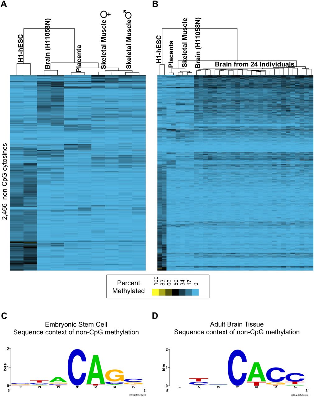 Non-CpG cytosine methylation. (A) We examined 82 cell lines and tissues and identified 2466 non-CpG cytosines that were methylated in both replicates. The samples with more than 200 methylated non-CpG cytosines are depicted. The human embryonic cell line (H1-hESC) contained 1418 methylated non-CpG cytosines, followed by adult human brain tissue (N = 666), placental tissue (N = 249), and skeletal muscle from two individuals (female N = 261, male N = 235). (B) The non-CpG cytosine methylation identified in the brain tissue was confirmed across post-mortem brain samples from 24 different individuals and occurs at a set of loci distinct from those methylated in the other samples. (C) The non-CpG cytosine methylation found in the embryonic stem cell line occurred primarily at the CAG sequence context, consistent with previous reports (Lister et al. 2009). (D) The non-CpG cytosine methylation discovered in the adult human brain tissue occurred primarily in the CACC sequence context.