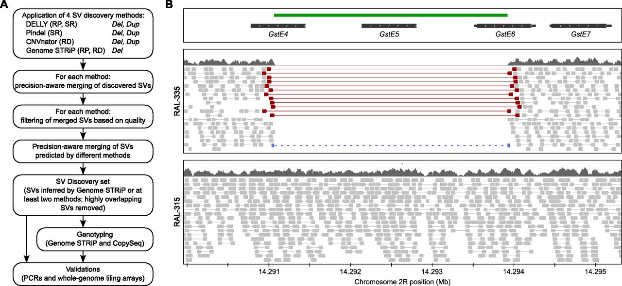 Structural variant (SV) discovery and genotyping. (A) Integrated pipeline for SV discovery, validation, and genotyping. (B) Example of a polymorphic deletion (highlighted in green), supported by discordantly mapping read pairs (red), split reads (blue), and read-depth (dark gray). Light gray boxes indicate individual sequencing reads. Indicated are a sample with the deletion (RAL-335) and one without (RAL-315) that variant.