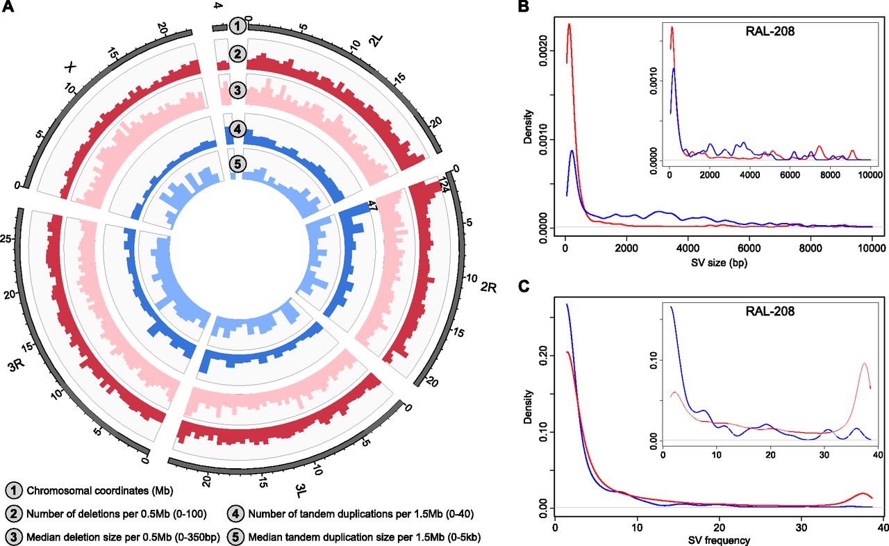 A sequencing-based map of SVs in the Drosophila melanogaster Genetic Reference Panel (DGRP). (A) Spatial and size distribution of deletions and tandem duplications in our SV discovery set. In two of the genomic windows indicated, which includes a SV hotspot region on chromosome 2R, the bars exceeded the displayed range (hence, their absolute height is indicated). (B) Size distribution of deletions (red) and tandem duplications (blue) in our entire discovery set (large plot) and in a single sample (RAL-208, small plot). The differences are owing to different frequency spectra of specific SV classes (see the Results section “Mechanisms of SV formation”). For deletions, several peaks are visible (e.g., 5, 7.5, and 9 kb), corresponding to mobile element insertions into the reference genome or to deletions of DNA transposons, which move by cut-and-paste mechanisms. (C) Frequency spectrum of deletions (red) and tandem duplications (blue) amongst 39 lines, indicated for the entire set of SVs (large plot) and for all SVs discovered in a single sample (RAL-208, small plot). While most SVs were discovered in less than five samples, a subset was present in >35 samples; most of the latter represent mobile element insertion and deletion events.