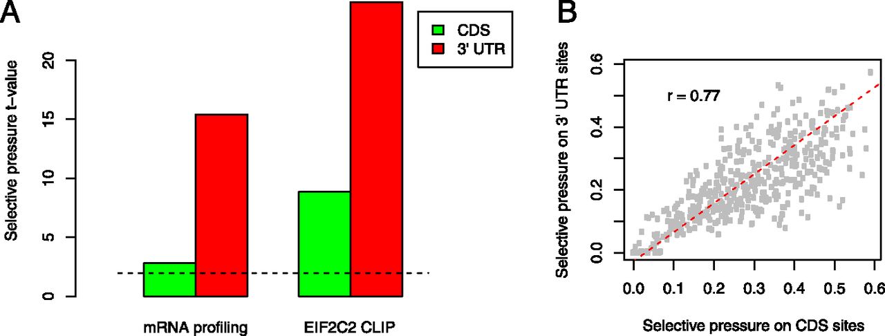 (A) CDS- and 3′ UTR-located miRNA binding sites that induce mRNA degradation or are isolated in EIF2C2 CLIP experiments are under stronger selection pressure compared with miRNA-complementary sites that were not functional in these experiments; 2274 CDS- and 3956 3′ UTR-located sites that induce mRNA degradation are compared with 3513 CDS- and 3268 3′ UTR-located sites that do not induce mRNA degradation; 751 CDS- and 786 3′ UTR-located sites isolated in EIF2C2 CLIP experiments are compared with 1059 CDS- and 956 3′ UTR-located sites that do not induce EIF2C2 binding. (B) Scatter plot of the inferred probabilities that CDS- and 3′ UTR-located sites complementary to individual miRNAs are under selection. (Dashed red line) First principal component of the scatter.