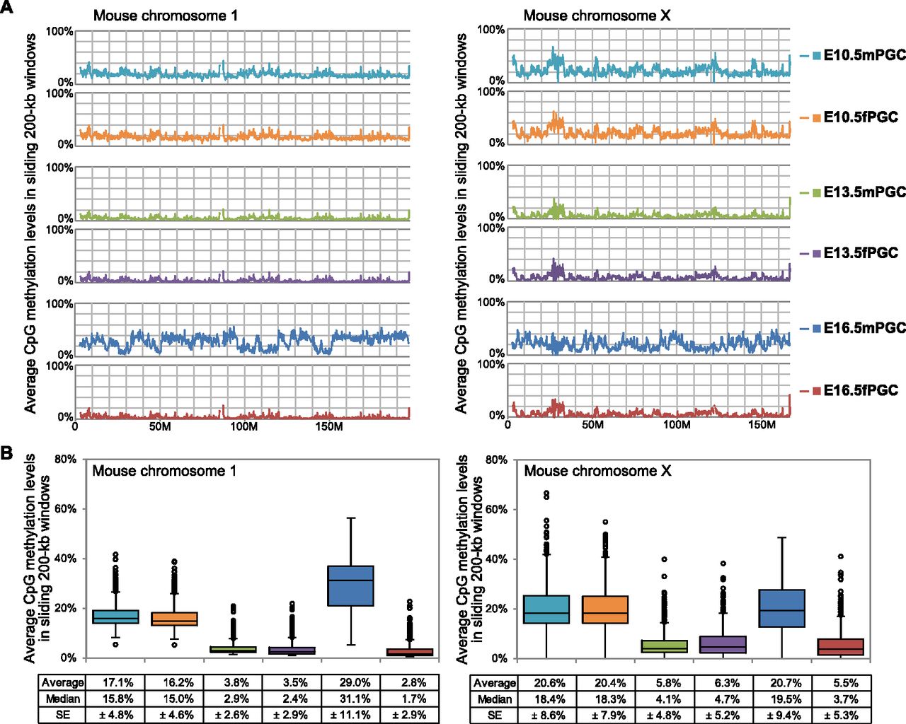 DNA methylome maps of chromosome 1 and chromosome X in mouse PGCs. (A) Chromosome-wide distribution of CpG methylation in sliding 200-kb windows. (Colored lines) The methylation levels in each PGC. (B) Box plots of each methylation level in 200-kb windows. Average and median methylation levels and standard errors (SEs) are shown below the graphs.