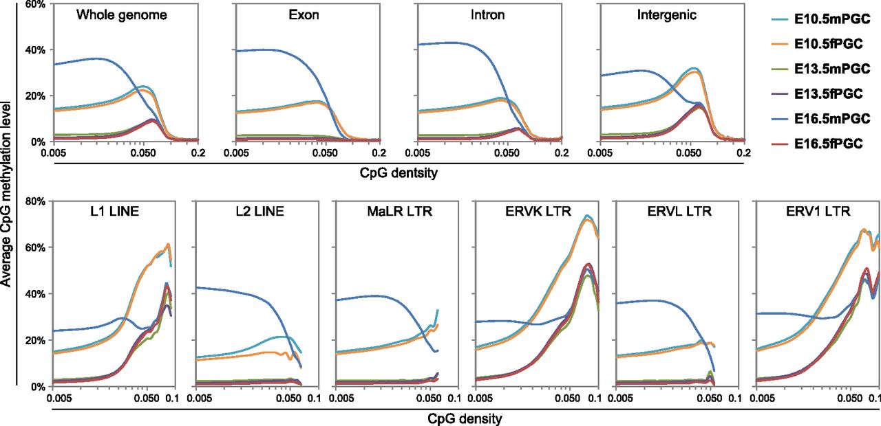 DNA methylation profiling of intra- and intergenic regions in mouse PGCs. CpG methylation levels are plotted as a function of CpG densities for whole-genome, exons, introns, intergenic regions (upper panels), and six major families of LINE/LTR retrotransposons (L1 LINEs, L2 LINEs, MaLR LTRs, ERVK LTRs, ERVL LTRs, and ERV1 LTRs [lower panels]).