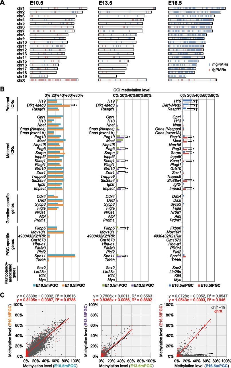 DNA methylation profiles of mouse CGIs in developing PGCs. (A) Chromosome distribution of male and female germ cell–specific preferentially methylated regions (mgPMRs and fgPMRs, respectively) in E10.5–E16.5 PGCs. Mann-Whitney's U-test was performed to determine gender-specific PMRs between male and female CpG methylation profiles of CGIs (FDR-adjusted P-values < 0.05). The locations of mgPMRs and fgPMRs are indicated as light blue and light red bars, respectively. (B) CpG methylation profiles of paternal ICRs, maternal ICRs, germline-specific genes, PGC-specific genes, and pluripotency-associated genes during PGC progression. (†) CGIs identified as mgPMRs; (*) CGIs identified as fgPMRs. (C) Scattergraphs show the relationships between the methylation levels of individual CGIs on autosomes (gray) and chromosome X (red) in male and female PGCs. Linear approximations with squared correlation coefficient (R2) values are shown at the top of each graph.