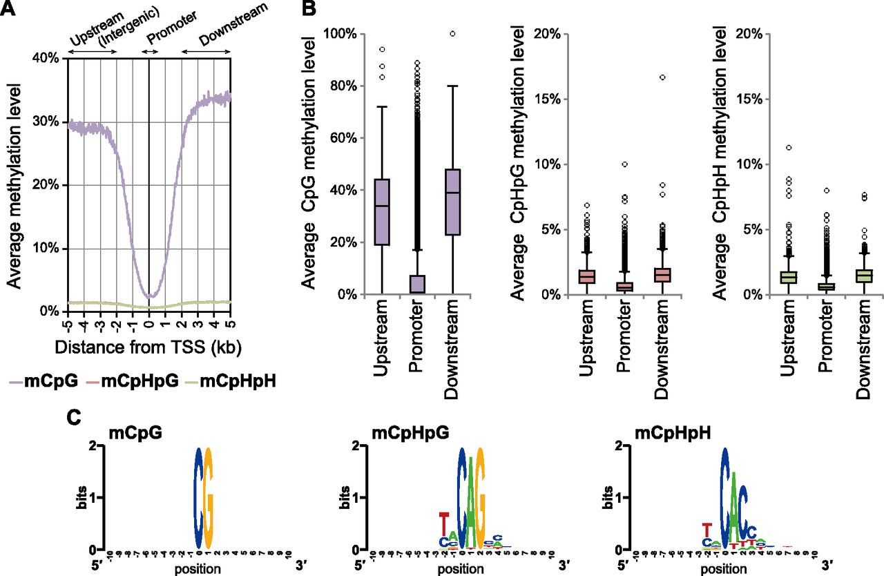 (A) The distribution of cytosine methylation in male gonocytes (E16.5mPGCs) is shown ±5 kb from the transcription start site (TSS). Methylation levels of CpG (light purple), CpHpG (red), and CpHpH (green) contexts. (B) Box plots of each methylation level for 20,854 RefSeq annotated genes at areas −2 to −5 kb from the TSS (upstream/intergenic), ±500 bp from the TSS (promoter), and +2 to +5 kb from the TSS (downstream). (C) WebLogo plots for sequences proximal to highly methylated cytosines (mC/C ≥ 50%) in all three sequence contexts in E16.5mPGCs.