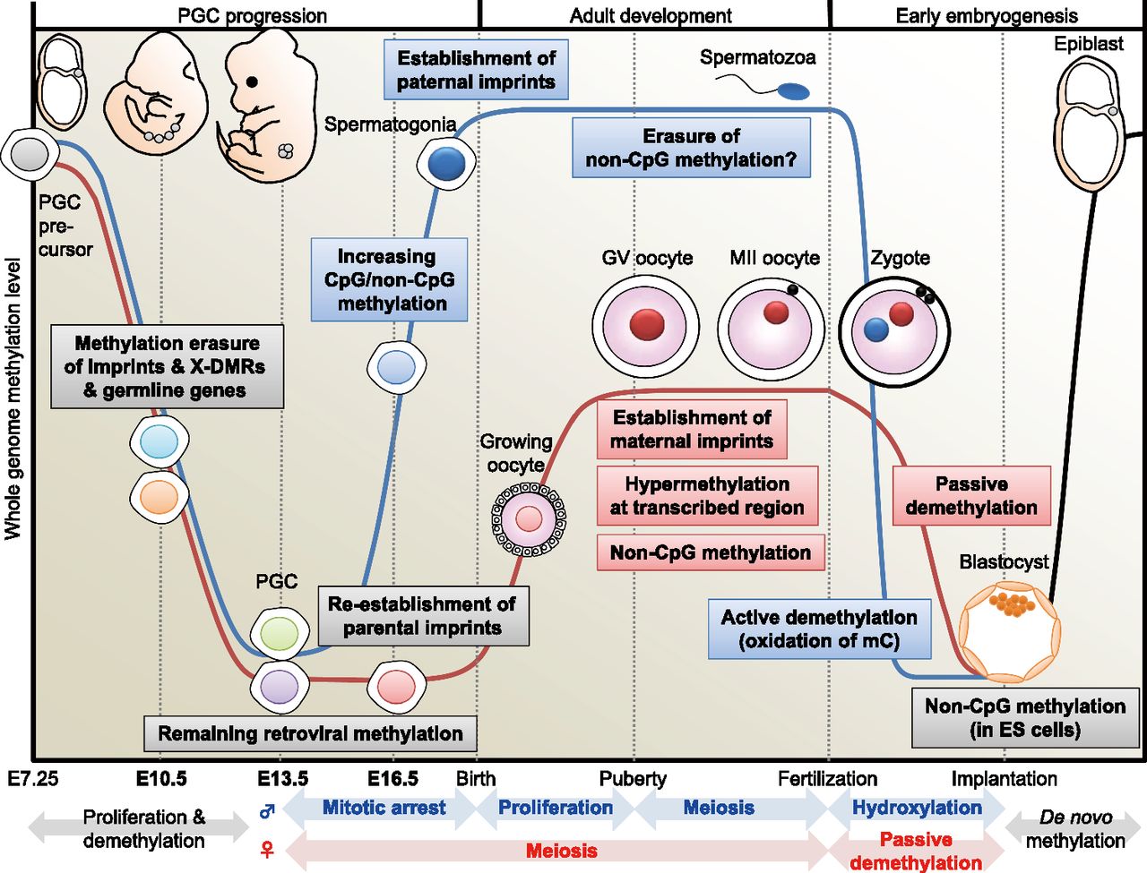 DNA methylome changes during gametogenesis and embryogenesis. Mouse PGCs emerge from precursor cells in the proximal epiblast at E7.25. They proliferate and migrate toward the genital ridge. Then, DNA methylation is globally decreased in both males (blue line) and females (red line) with erasure of methylation marks of imprinted genes, X-linked genes (only in females), and some germline-specific genes (see Fig. 4) through TET-catalyzed oxidation (Hackett et al. 2013). During this migration, whole-genome CpG methylation levels are relatively higher in males than in females (see Fig. 2). Following gonadal sex determination, new DNA methylation patterns are established in each germ cell in a sex-specific manner. In the male embryo, de novo CpG and non-CpG methylation occurs in mitotically arrested gonocytes (see Fig. 5). Establishment of the paternal methylation imprints (e.g., H19) is completed before birth (meiosis), and these imprints are maintained during subsequent spermatogenesis and throughout meiosis; however, the presence of non-CpG methylation is rarely observed in the mature spermatozoon. In the female embryo, PGCs enter meiosis as primary oocytes and arrest in the prophase of the first meiotic division; the oocyte genome remains globally hypomethylated, but parts of maternal ICRs (e.g., Peg10, Mest, Peg3, Snrpn) exhibit partial methylation (see Fig. 4). DNA methylation marks are established after birth during the growth phase of the oocyte. At puberty, fully grown oocytes are still arrested at meiotic prophase, a stage known as the germinal vesicle (GV) stage. The GV oocyte genome exhibits global hypermethylation at transcribed regions, but the whole-genome CpG methylation level of oocytes is less than half that of spermatozoa (Kobayashi et al. 2012). When GV oocytes resume the first meiotic division, they undergo GV breakdown, extrude a first polar body, and develop to metaphase of the second meiotic division (MII). MII oocytes complete meiosis only with fertilization. In the zygote, striking asymmetric DNA demethylation between the two parental genomes is observed within the zygote's cytoplasm. The paternal genome is actively demethylated before the first mitotic division through the involvement of TET protein-mediated 5-methylcytosine oxidation (conversion to 5-hydroxymethylcytosine) (Gu et al. 2011; Wossidlo et al. 2011). The maternal genome resists hydroxylation (Nakamura et al. 2012) and instead undergoes passive DNA replication-dependent demethylation. Multiple maternal and zygotic DNA-binding factors specifically recognize ICRs and protect them from these post-fertilization demethylation events (Nakamura et al. 2007; Li et al. 2008; Messerschmidt et al. 2012), resulting in epigenetic allelic asymmetries that affect associated imprinted genes. Following blastocyst implantation, the embryo undergoes a wave of de novo methylation (black line) that establishes a new DNA methylation landscape, and this process is associated with cellular differentiation.