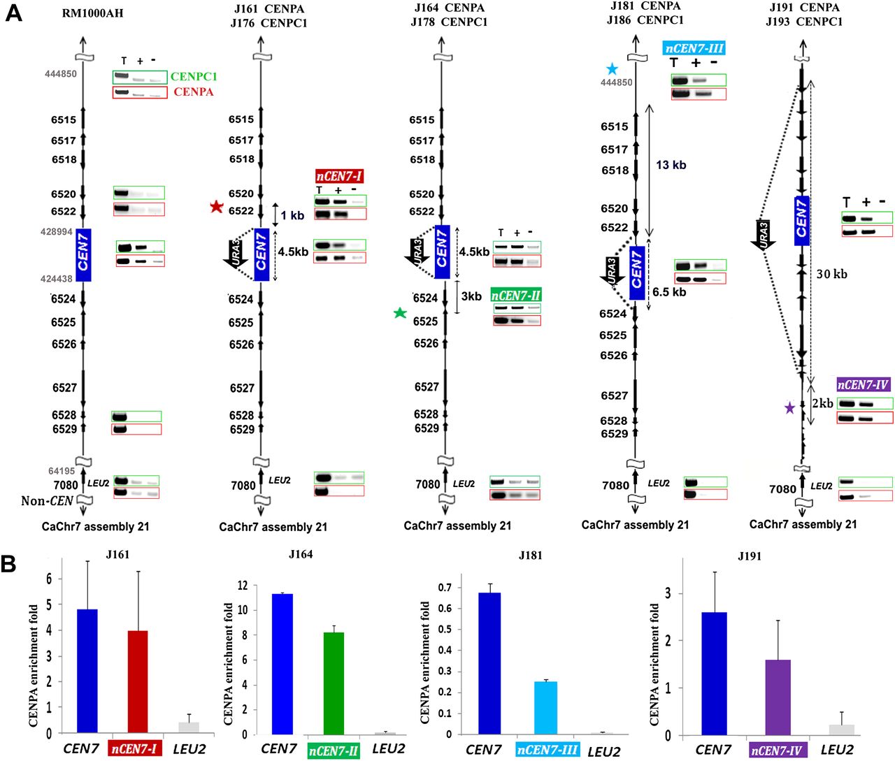 Neocentromeres, like centromeres, preferentially form on specific chromosomal locations in a nonrandom fashion independent of the length of the deleted region in C. albicans. (A) CENPA and CENPC1 ChIP analyses in RM1000AH-cen7Δ, RM1000AH-cen7-6.5 kbΔ, or RM1000AH-cen7-30kbΔ clones mapped neocentromeres (nCENs) within 15 kb from the deleted region. C. albicans is a diploid yeast and carries two homologs of each chromosome. Only one homolog of Chr7 where CEN7 has been replaced by URA3 is shown. CENPA enrichment shown at the native CEN7 location is contributed by an unaltered homolog and is shown as a positive control for CENPA ChIP assays. Thick black arrows along with the Orf numbers show the gene arrangement and the direction of transcription. One representative clone from each class (see Supplemental Figs. S3C, S4B for other clones) is shown. Class I neocentromeres (nCEN7-I) formed on Orf19.6520 and Orf19.6522 (10/11 RM1000AH-cen7Δ and 4/5 RM1000AH-cen-6.5kbΔ transformants), Class II neocentromeres (nCEN7-II) mapped to Orf19.6526 and Orf19.6525 (1/11 RM1000AH-cen7Δ), Class III neocentromeres (nCEN7-III) mapped on an Orf-free region—Assembly 21, CaChr7 Coordinates 442000–445000 (1/5 RM1000AH-cen-6.5kbΔ transformant)—and nCEN7-IV mapped on Orf19.6531, Orf19.6532, Orf19.6533, Orf19.6534 (2/2 RM1000AH-cen7-30kbΔ transformants). Parent RM1000AH did not show CENPA or CENPC1 enrichment on these neocentromere sites. Coordinates of the control non-CEN (LEU2) region on Chr7 in Assembly 21 are 64195–64440 (Orf 19.7080). (T) Total DNA; (+) with Ab; (−) without Ab (beads only). CENPA ChIP profiles are shown in red boxes and the same for CENPC1 are shown in green boxes. Enrichment of CENPA at the URA3 location was not shown here but presented as a separate figure (Supplemental Fig. S5A). (B) CENPA ChIP qPCR analysis showing fold enrichment of CENPA on native and neocentromeres.